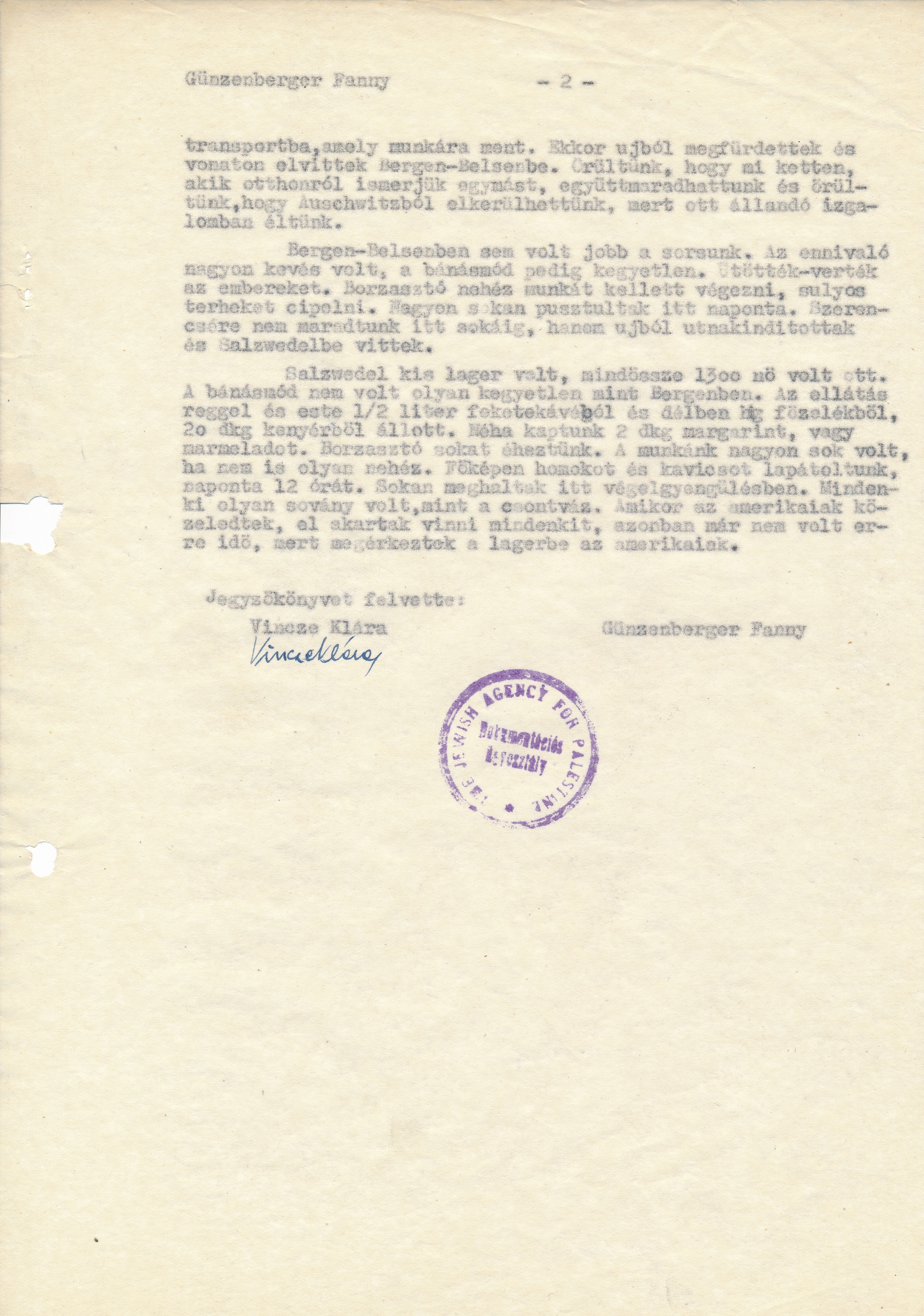 Bergen-Belsenben sem volt jobb a sorsunk. Az ennivaló nagyon kevés volt a bánásmód, pedig kegyetlen. Ütötték-verték az embereket. Borzasztó nehéz munkát kellett végezni, súlyos terheket cipelni. Nagyon sokan pusztultak itt naponta. Szerencsére nem maradtunk itt sokáig, hanem újból útnak indítottak és Salzwedelbe vittek.