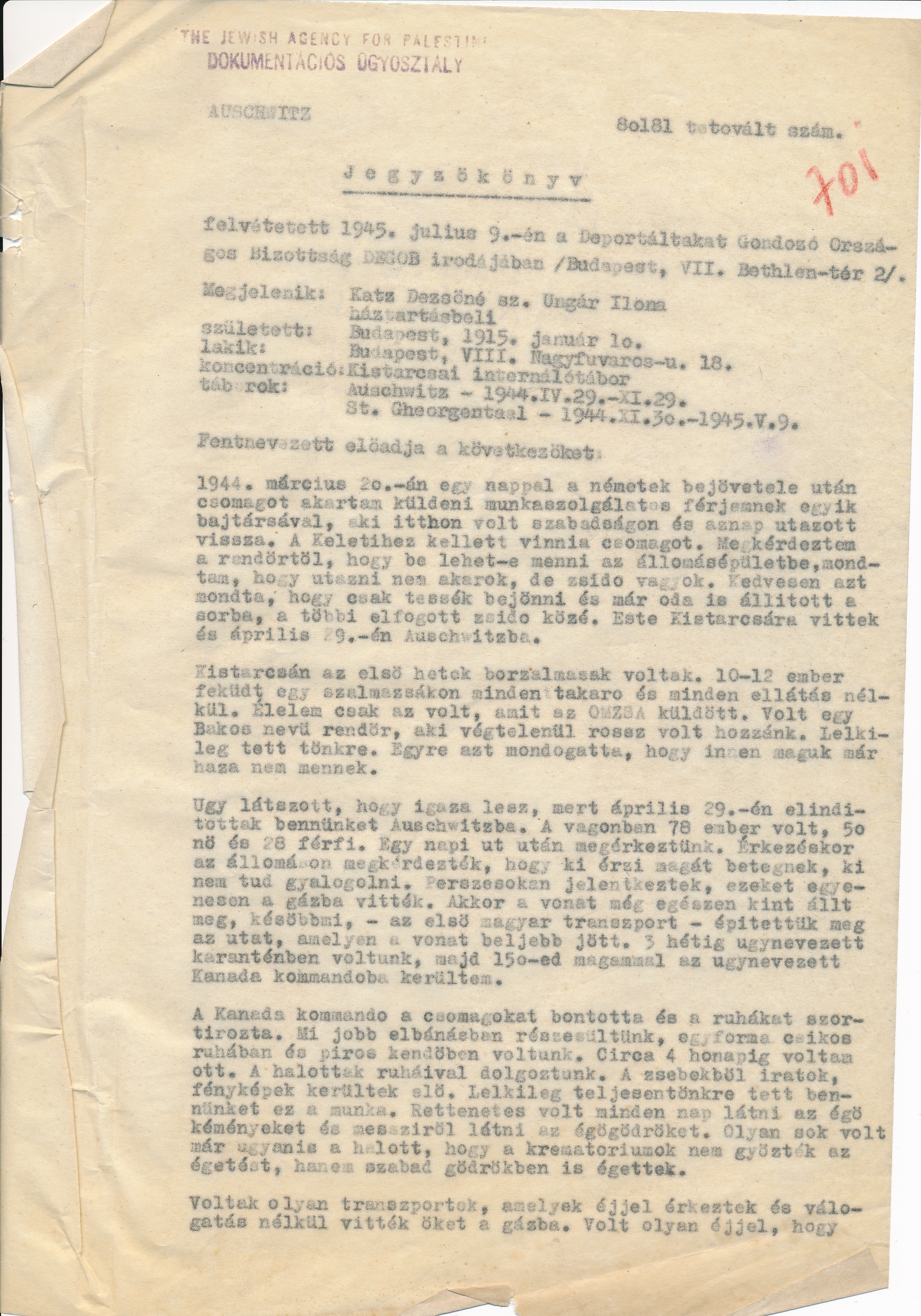 1944. március 20-án egy nappal a .németek bejövetele után csomagot akartam küldeni munkaszolgálatos férjemnek egyik bajtársával, aki itthon volt szabadságon és aznap utazott vissza. A Keletihez kellett vinni a csomagot. Megkérdeztem a rendőrtől, hogy be lehet-e meni az állomás épületbe, mondtam, hogy utazni nem akarok, de zsidó vagyok. Kedvesen azt mondta, hogy csak tessék bejönni és már oda is állított a sorba, a többi elfogott zsidó közé. Este Kistarcsára vittek és április 29-én Auschwitzba.Kistarcsán az első hetek borzalmasak voltak. 10-12 ember feküdt egy szalmazsákon minden takaró és minden ellátás nélkül. Élelem csak az volt, amit az OMHSA küldött. Volt egy Bakos nevű rendőr, aki végtelenül rossz volt hozzánk. Lelkileg tett tönkre. Egyre azt mondogatta, hogy innen maguk már haza nem mennek.Úgy látszott, hogy igaza lesz, mert április 29-én elindítottak bennünket Auschwitzba. A vagonban 78 embervolt, 50 nő és 28 férfi. Egy napi út után megérkeztünk. Érkezéskor az állomáson megkérdezték, hogy ki érzi magáét betegnek, ki nem tud gyalogolni. Persze sokan jelentkeztek, ezeket egyenesen a gázba vitték. Akkor a vonat még egészen kint állt meg, később mi - az első magyar transzport - építettük meg az utat, amelyen a vonat beljebb jött. 3 hétig úgynevezett karanténban voltunk, majd 150-ed magammal az úgynevezett Kanada kommandóba kerültem. A Kanada kommandó a csomagokat bontotta és a ruhákat szortírozta. Mi jobb elbánásban részesültünk, egyforma csíkos ruhában és piros kendőben voltunk. Cirka 4 hónapig voltam ott. A halottak ruháival dolgoztunk. A zsebekből iratok, fényképek kerültek elő. Lelkileg teljesen tönkre tett bennünket ez a munka. Rettenetes volt mindennap látni az égő kéményeket és messziről látni az égő gödröket. Olyan sok volt már ugyanis a halott, hogy a krematóriumot nem győzték az égetést, hanem szabad gödrökben is égettek. Voltak olyan transzportok, amelyek éjjel érkeztek és válogatás nélkül vitték őket a gázba. Volt olyan éjjel, hogy