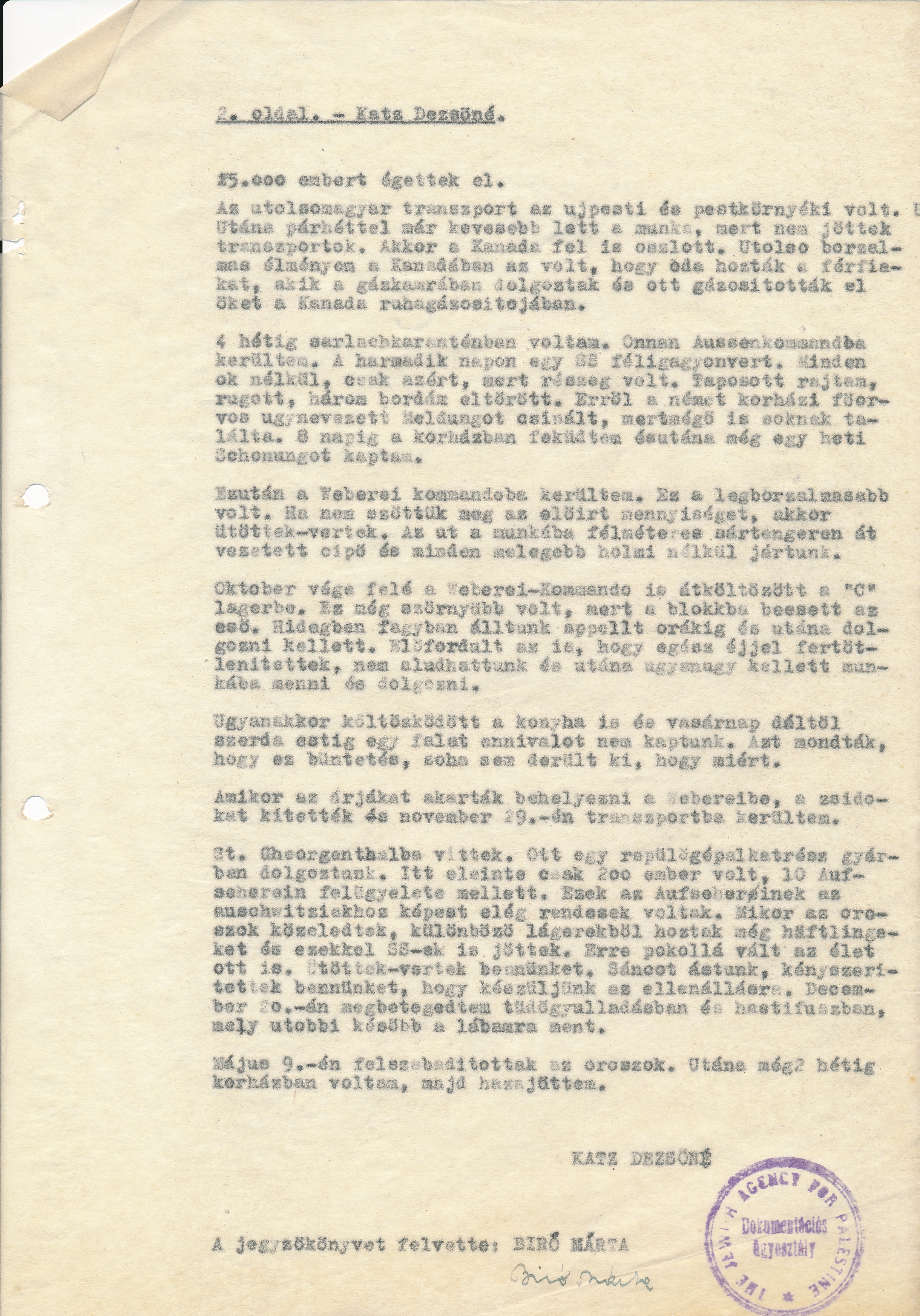 25.000 embert égettek el.Az utolsómagyar transzport az újpesti és pestkörnyéki volt. Utána pár héttel már kevesebb lett a munka, mert nem jöttek transzportok. Akkor a Kanada fel is oszlott. Utolsó borzalmas élményem a Kanadában az volt, hogy oda hozták a férfiakat, akik a gázkamrábandolgoztak és ott gázosították el őket a Kanadaruhagázosítójában. 4 hétig sarlach-karanténban voltam. Onnan Aussenkommendóba kerültem. A harmadik napon egy SS félig agyonvert. Minden ok nélkül, csak azért, mert részeg volt. Taposott rajtam, rúgott, három bordám eltörött. Erről a német kórházi főorvos úgynevezett Meldungot csinált, mert még ő is soknak találta. 8 napig a kórházban feküdtem és utána még egy heti Schonungot kaptam.Ezután a Weberei kommandóba kerültem. Ez a legborzalmasabb volt. Ha nem szőttük meg az előírt mennyiséget, akkor ütöttek-vertek. Az út a munkába félméteres sártengeren átvezetett cipő és minden melegebb holmi nélkül jártunk. Október vége felé a Weberei-Kommando is átköltözött a "C" lagerbe. Ez még szörnyűbb volt, mert a blokkba beesett az eső. Hidegben fagyban álltunk appellt órákig és utána dolgozni kellett. Előfordult az is, hogy egész éjjel fertőtlenítettek, nem aludhattunk és utána ugyanúgy kellett munkába menni és dolgozni. Ugyanakkor költözködött a konya is és vasárnap déltől szerda estig egy falat ennivalót nem kaptunk. Azt mondták, hogy ez büntetés, soha sem derült ki, hogy miért. Amikor az árjákat akarták behelyezni a ebereibe, a zsidókat kitették és november 29-én transzportba kerültem.St. Gheorgenthalba vittek. Ott egy repülőgép alkatrész gyárban dolgoztunk. Itt eleinte csak 200 ember volt, 10 Aufseherein felügyelete mellett. Ezek az Aufsehereinek az auschwitziakhoz képest elég rendesek voltak. Mikor az oroszok közeledtek, különböző lágerekből hoztak még häftlingeket és ezekkel SS-ek is jöttek. Erre pokollá vált az élet ott is. Ütöttek-vertek bennünket. Sáncot ástunk, kényszerítettek bennünket, hogy készüljünk az ellenállásra. December 20-án megbetegedtemtüdőgyulladásban és hastífuszban, mely utóbbi később a lábamra ment. Május 9-én felszabadítottak az oroszok. Utána még 2 hétig kórházban voltam, majd hazajöttem.