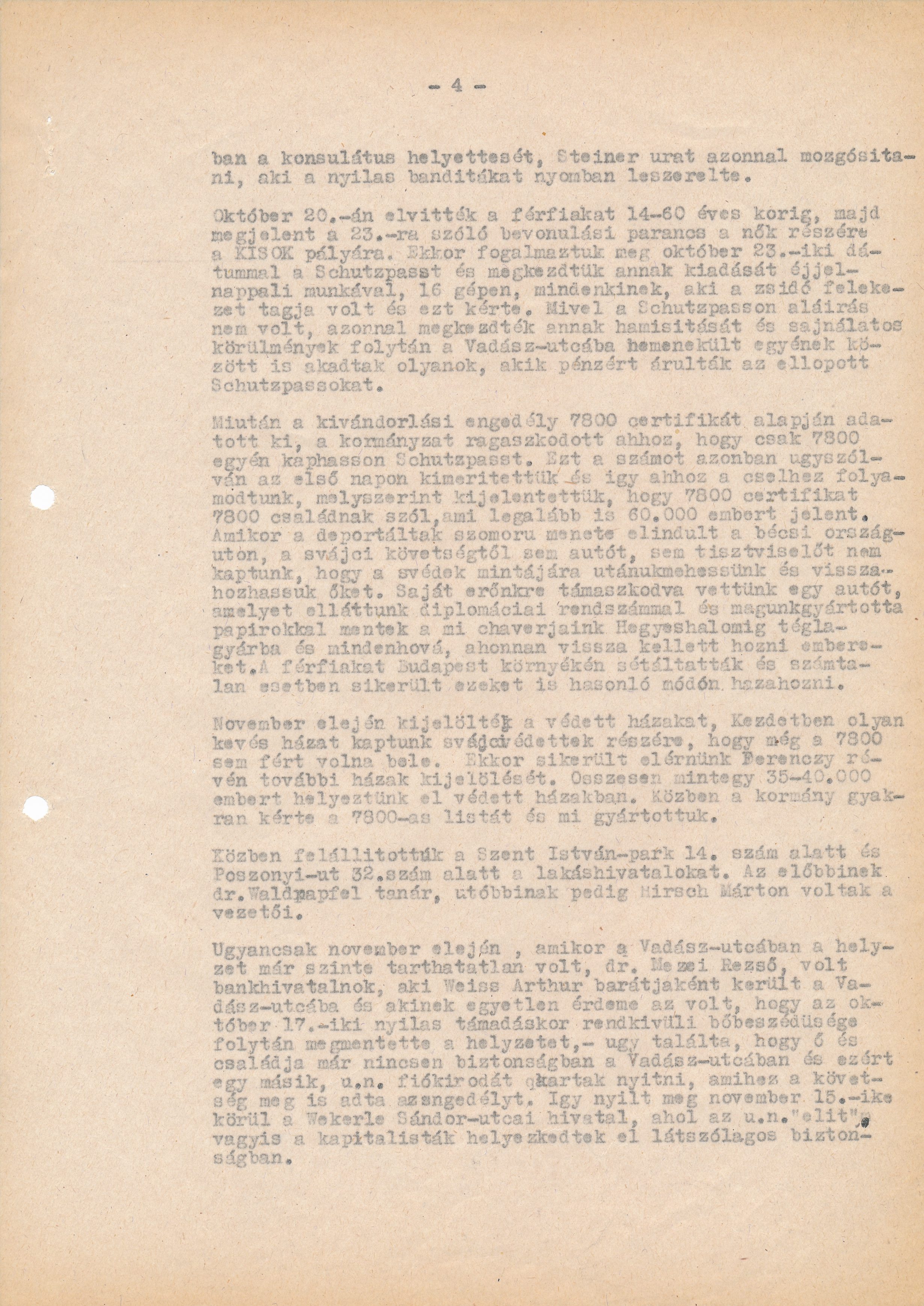 The 20th of October, men between the age of 14 to 60 were taken away, and women were ordered to be called up for the labour service by the 23rd. The indicated place was the sports grounds of the National Centre for High School Sports Clubs. We phrased the text of the Schutzpass that day, we dated them to the 23rd of October, copied them on 16 typewriters by day and night, and started to distribute them to anyone who belonged to the Jewish religion and made an appeal for them. Since there were no signatures on the Schutzpass, we right away forged them. Unfortunately, even among people who found asylum in Vadász Street there were some who sold these stolen copies Schutzpass for money.
