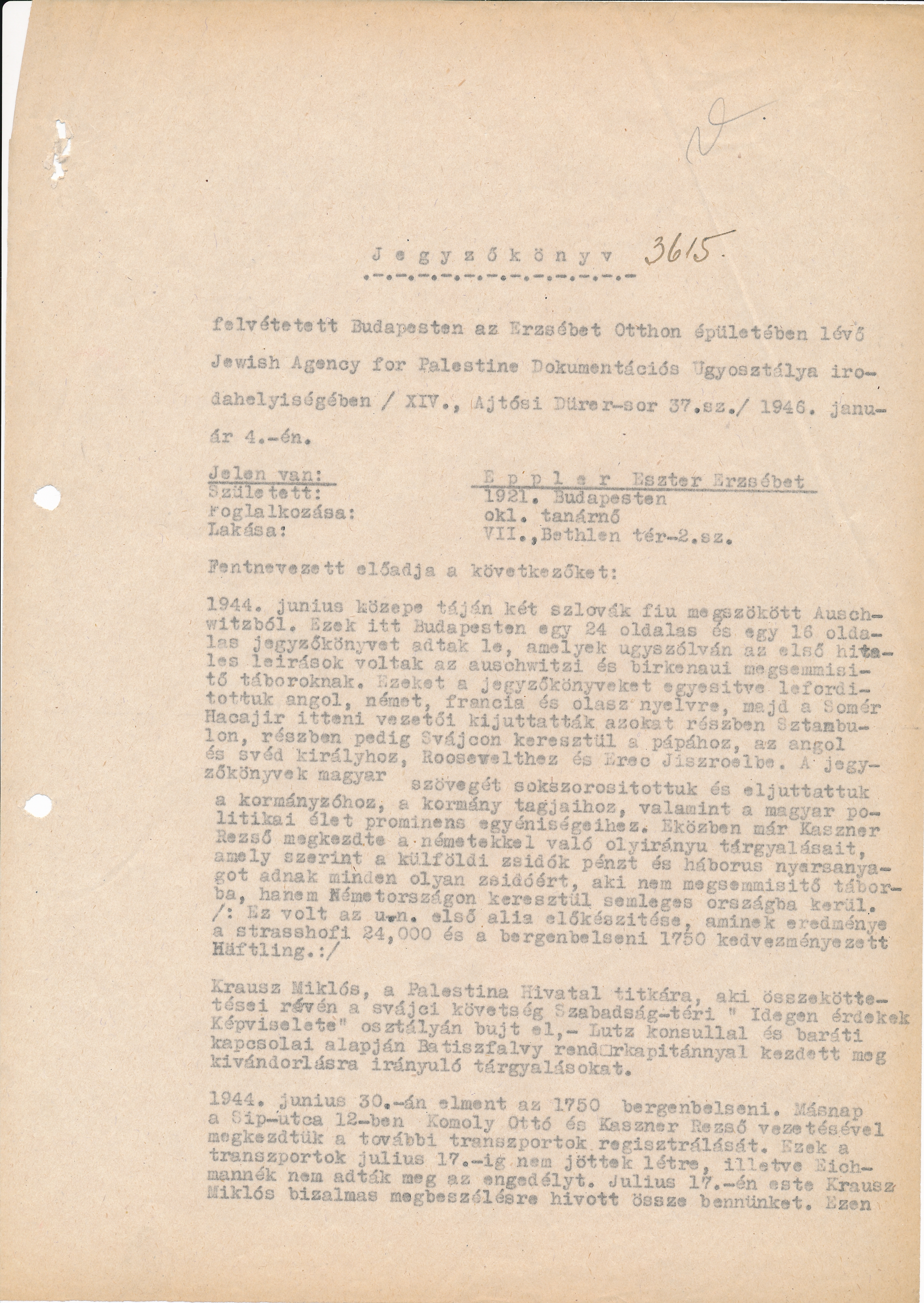 1944. június közepe táján két szlovák fiú megszököttAuschwitzból. Ezek itt Budapesten egy 24 oldalas