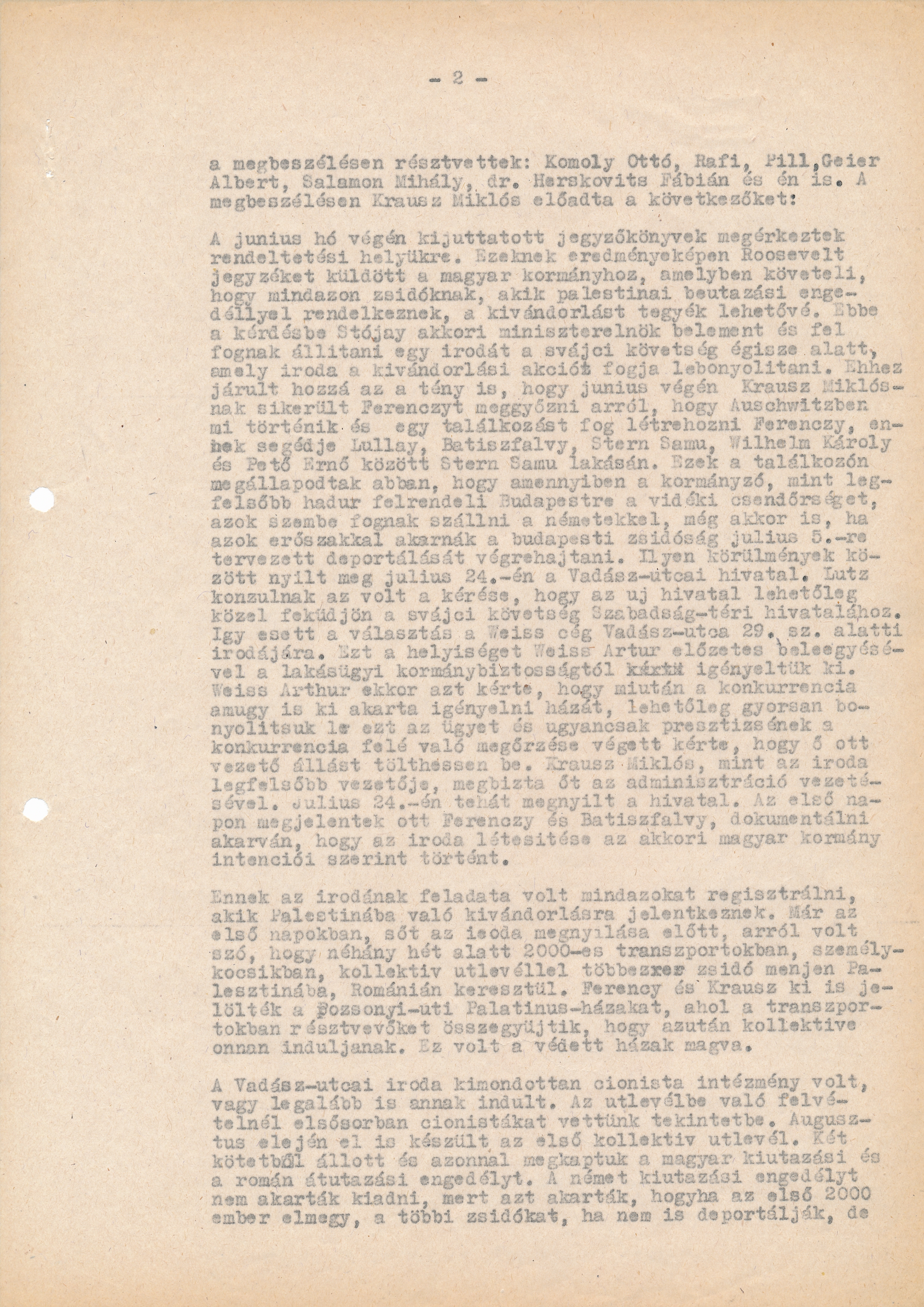 The minutes we sent out at the end of June did reach their destination. As a result Roosevelt sent a memorial to the Hungarian government, demanding they made possible the emigration of those Jews who had a valid entry permit. This demand was answered by Prime Minister Sztójay, who agreed to set up an office coordinating the process of emigration as a part of the Swiss Embassy. On the top of that, at the end of June Miklós Krausz managed to make Ferenczy believe what was indeed happening in Auschwitz, and achieved that there would be a meeting organised between Ferenczy, his assistant Lullay, Batiszfalvy, Samu Stern,Károly Wilhelm and Ernő Pető in the flat of Samu Stern. At this meeting they agreed that in case the Regent (as the supreme commander) instructed the gendarmes of the countryside to come to Budapest, these would resist Germans even if they used force to deport the Jews on the 5th of July, which was the agreed date. That is what preceded the opening of the office in Vadász Street on the 24th of July. Consul Lutz requested that the office lay not far from the Swiss Embassy on Szabadság Square. We chose the office of the Weiss company in 29 Vadász Street. We made an appeal for this place in agreement with Artur Weiss, to the Housing Office of the government. Artur Weiss asked us to set up the office as soon as possible since the building would have been soon demanded also by his business rivals, and to preserve his dignity towards these rivals he also wanted to obtain a chief position there. Miklós Krausz as the head of the office entrusted him to be the administrative head. The office opened the 24th of July. The first days Ferenczy and Batiszfalvy came to control whether the office functioned according to the intentions of the Hungarian government.