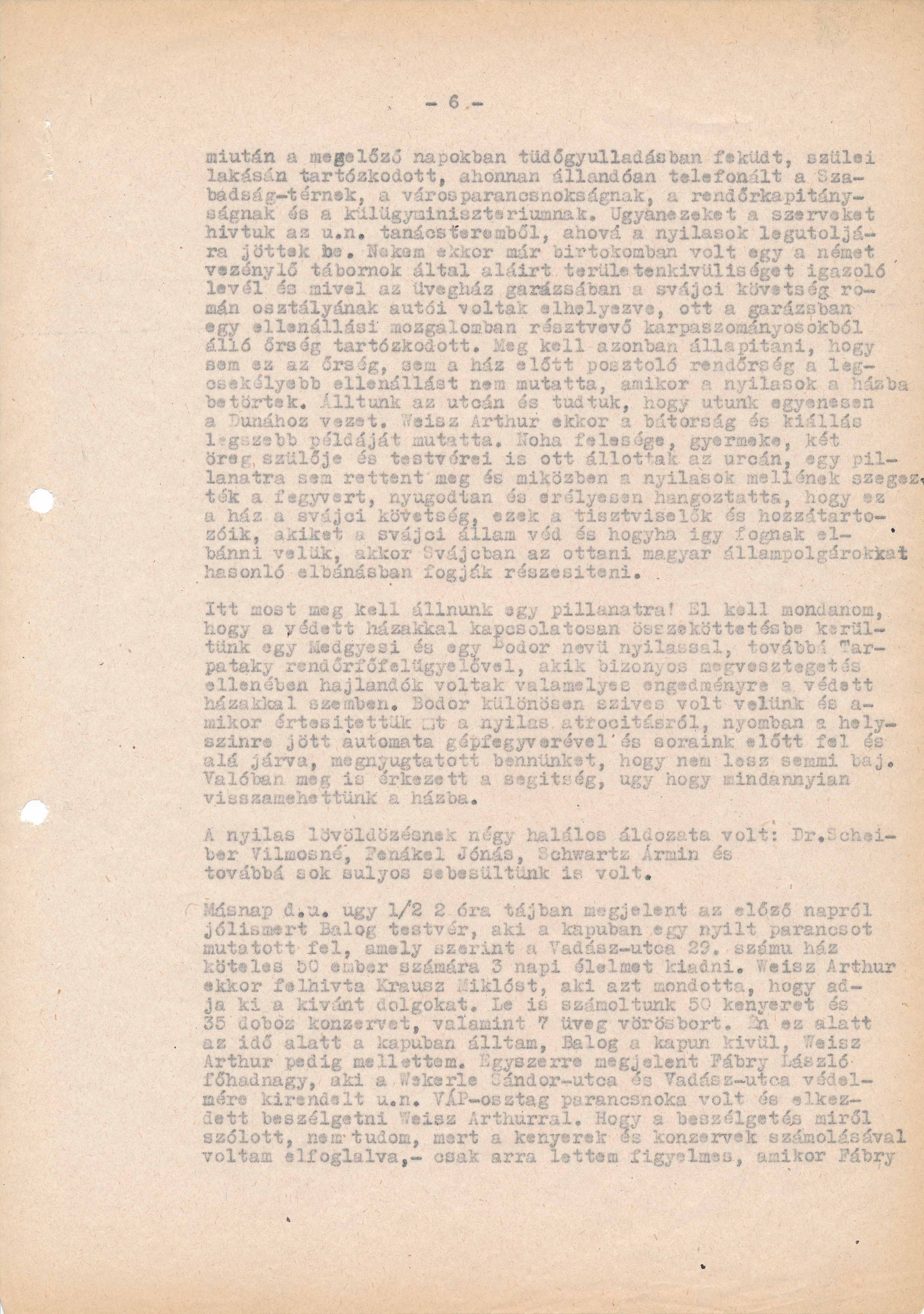 jöjjön velem nyugodtan Weiss úr, mire én héberül odaszóltam Weisz Arthurnak, hogy ne menjen. Erre ő fölényesen legyintett. Fábry ezután beültette Weiss Arthurt autójába, Balog pedig ellenkező irányban távozott. Tíz perc múlva már visszajött azzal, hogy tiszt becsületszavára kijelenti, miszerint Weiss Arthur 5 órakor odahaz lesz. Mint később kiderült, átadta Balognak, aki a Városház utca 14-be vitte, onnan pedig valószínűleg a Dunába. Amikor Fábry állítólag értement a Városház utcába, ott azt mondották neki, hogy elengedték Weiss Arthurt. Ezzel a Vadász utcában napról-napra fokozódott a pánik, ami két nap alatt elérte tetőpontját és azután azostrom egyéb izgalmai miatt teljesen el is múlt. Ezután a nyilasok még vagy kétszer jöttekélelmiszerekért, minden alkalommal azonban már a kapuban kiabálták, hogy egy zsidónak sem lesz semmi baja, csupán ennivalóért jöttek. Természetes, hogy készséggel adtunk nekik enni, mintsem, hogy bajunk történjék. Január 6-án délután történt, hogy Fränkl Jenő valamiért egy futárt küldött ki, akit a ház előtt Pálóczy színészből lett nyilas detektív igazoltatott és miközben igazoltatták, a fiú kiabált, hogy innen jött ki a Vadász utcából, futár vagyok - ebben a pillanatban futott a követség elé a követség autója, amelyből Gedeon Andor és Szemere Tibor tisztviselők szálltak ki, míg Hunwald Szimcha chavér, aki Kühne János néven volt a követség tisztviselője, a kocsiban maradt. Gedeon bejött a kapun, ebben a pillanatban Szemere észrevette már a kapuban állva, hogy a futár szalad a követség felé. Egy lövés dördült el és a fiú