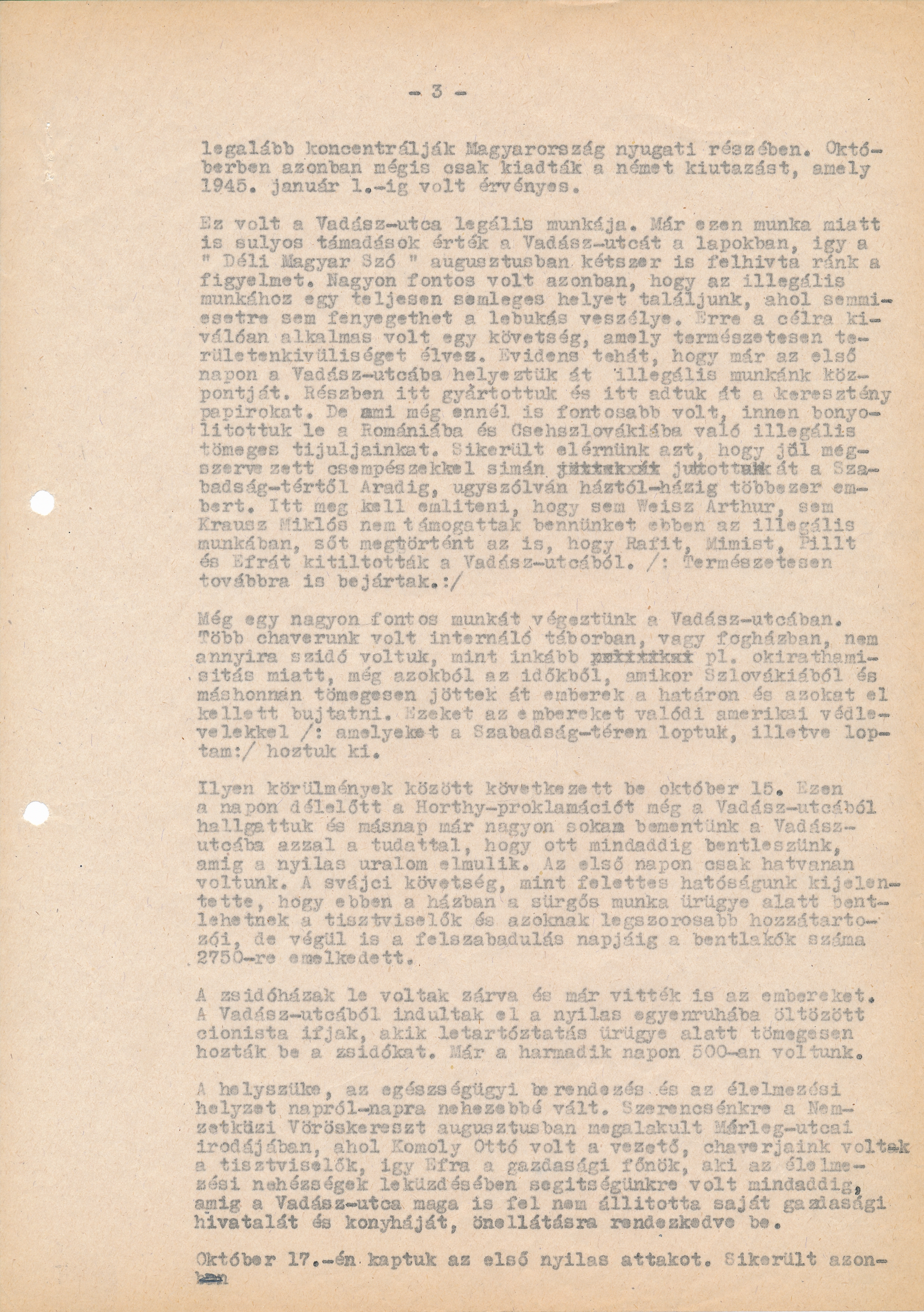 Déli Magyar Szóaugusztusban kétszer is felhívta ránk a figyelmet. Nagyon fontos volt azonban, hogy az illegális munkához egy teljesen semleges helyet találjunk, ahol semmiesetre sem fenyegethet a lebukás veszélye. Erre a célra kiválóan alkalmas volt egy követség, amely természetesen területenkívüliséget élvez. Evidens tehát, hogy már az első napon a Vadász utcába helyeztük át illegális munkánk központját. Részben itt gyártottuk és itt adtuk át a keresztény papírokat. De ami még ennél is fontosabb volt, innen bonyolítottuk le a Romániába és Csehszlovákiába való illegális tömeges tijuljainkat. Sikerült elérnünk azt, hogy jól megszervezett csempészekkel simán juttattunk át a Szabadság-tértől Aradig, úgyszólván háztól-házig többezer embert. Itt meg kell említeni, hogy sem Weisz Arthur, sem Krausz Miklós nem támogattak bennünket ebben az illegális munkában, sőt megtörtént az is, hogy Rafit, Mimist, Pillt és Efrát kitiltották a Vadász utcából. (természetesen továbbra is bejártak.) Még egy nagyon fontos munkát végeztünk a Vadász utcában. Többchaverunk volt internáló táborban, vagy fogházban, nem annyira zsidó voltuk, mint inkább pl. okirathamisítás miatt, még azokból az időkből, amikor Szlovákiából és máshonnan tömegesen jöttek át emberek a határon és azokat el kellettbújtatni. Ezeket az embereket valódi amerikai védlevelekkel (amelyeket a Szabadság téren loptuk, illetve loptam) hoztuk ki. Ilyen körülmények között következett be október 15. Ezen a napon délelőtt a Horthy-proklamációt még a Vadász utcából hallgattuk és másnap már nagyon sokan bementünk a Vadász utcába azzal a tudattal, hogy ott mindaddig bent leszünk, amíg a nyilas uralom elmúlik. Az első napon csak hatvanan voltunk. A svájci követség, mint felettes hatóságunk kijelentette, hogy ebben a házban a sürgős munka ürügye alatt bentlehetnek a tisztviselők és azoknak legszorosabb hozzátartozói, de végül is a felszabadulás napjáig a bentlakók száma 2750-re emelkedett. A zsidóházak le voltak zárva és már vitték is az embereket. A Vadász utcából indultak el a nyilasegyenruhába öltözött cionista ifjak, akik letartóztatás ürügye alatt tömegesen hozták be a zsidókat. Már a harmadik napon 500-an voltunk. Ahelyszűke, az egészségügyi berendezés és az élelmezési helyzet napról-napra nehezebbé vált. Szerencsénkre a Nemzetközi Vöröskereszt augusztusban megalakult Mérleg utcai irodájában, ahol Komoly Ottó volt a vezető, chaverjaink voltak a tisztviselők, így Efra a gazdasági főnök, aki az élelmezési nehézségek leküzdésében segítségünkre volt mindaddig, amíg a Vadász utca maga is fel nem állította saját gazdasági hivatalát és konyháját, önellátásra rendezkedve be. Október 17-én kaptuk az első nyilasattakot. Sikerült azon