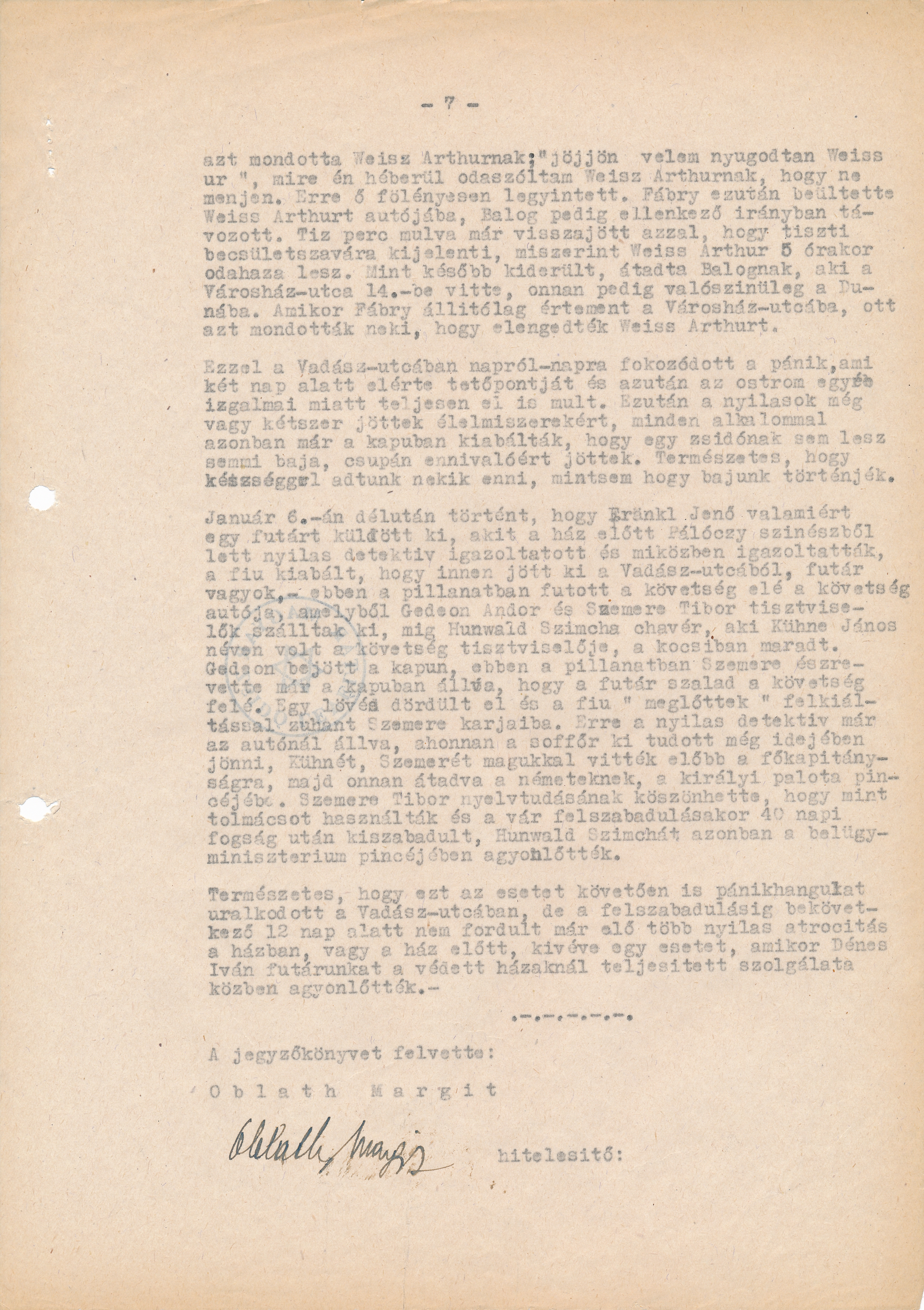 Take it easy and come with me Mr. Weiss, to what I reacted in Hebrew telling Artur Weiss not to go. He made a gesture in an offhand manner. Fábry then put Artur Weiss in his car, while Balog left in the opposite direction. He came back in 10 minutes claiming that Artur Weiss would be back by 5 pm giving his word of honour as an officer of the army. As we found out later, he gave Weiss to Balog who took him to 14 Városház Street and from there presumably into the Danube. When Fábry went to fetch him in Városház Street, as he claimed to have done, he was told that Artur Weiss had been already let go.
