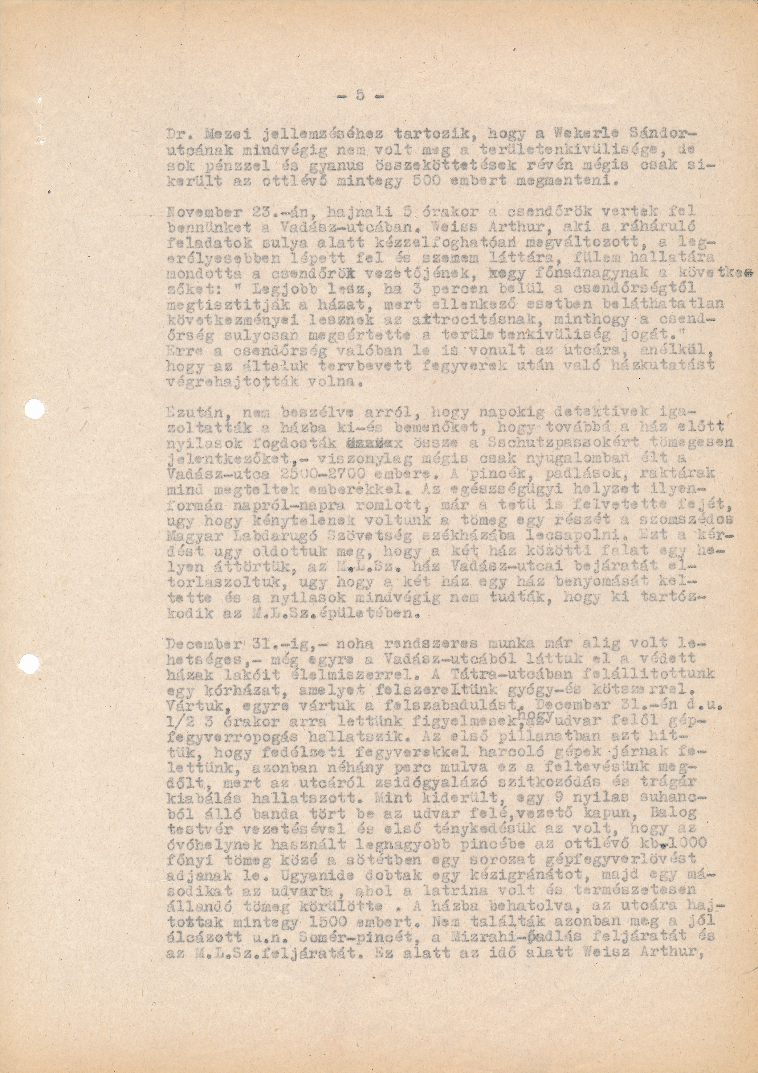 Legjobb lesz, ha 3 percen belül a csendőrségtől megtisztítják a házat, mert ellenkező esetben beláthatatlan következményei lesznek az attrocitásnak, minthogy a csendőrség súlyosan megsértette a területenkívüliségjogát.Erre a csendőrség valóban le is vonult az utcára, anélkül, hogy az általuk tervbevett fegyverek után való házkutatást végrehajtották volna. Ezután, nem beszélve arról, hogy napokig detektivek igazoltatták a házba ki- és bemenőket, hogy továbbá a ház előtt nyilasok fogdosták össze a Schutzpass okért tömegesen jelentkezőket - viszonylag mégis csak nyugalomban élt a Vadász utca 2500-2700 embere. A pincék, padlások, raktárak mind megteltek emberekkel. Az egészségügyi helyzet ilyenformán napról-napra romlott, már a tetű is felvetette a fejét, úgy hogy kénytelenek voltunk a tömeg egy részét a szomszédos Magyar Labdarúgó Szövetség székházába lecsapolni. Ezt a kérdést úgy oldottuk meg, hogy a két ház közötti falat egy helyen áttörtük, az M.L.Sz. házVadász utcai bejáratát eltorlaszoltuk, úgy hogy a két ház egy ház benyomásást keltette és a nyilasok mindvégig nem tudták, hogy ki tartózkodik az M.L.Sz épületében. December 31-ig - noha rendszeres munka már alig volt lehetséges - még egyre a Vadász utcából láttuk el a védett házak lakóit élelmiszerrel. A Tátra utcában felállítottunk egy kórházat, amelyet felszereltünk gyógy- és kötszerrel. Vártuk, egyre vártuk a felszabadulást. December 31-én du. 1/2 3 órakor arra lettünk figyelmesek, hogy az udvar felől gépfegyverropogás hallatszik. Az első pillanatban azt hittük, hogy fedélzeti fegyverekkel harcoló gépek járnak felettünk, azonban néhány perc múlva ez a feltevésünk megdőlt, mert az utcáról zsidógyalázó szitkozódás és trágár kiabálás hallatszott. Mint kiderült, egy 9 nyilas suhancból álló banda tört be az udvar felé vezető kapun. Balog testvér vezetésével az első ténykedésük az volt, hogy az óvóhelynek használt legnagyobb pincébe az ottlévő kb. 1000 főnyi tömeg közé a sötétben egy sorozat gépfegyverlövést adjanak le. Ugyanide dobtak egy kézigránátot, majd egy másodikat az udvarba, ahol a latrina volt és természetesen állandó tömeg körülötte. A házba behatolva, az utcára hajtottak mintegy 1500 embert. Nem találták azonban meg a jól álcázott un. Somér-pincét, a Mizrahi-padlás feljáratát és az M.L.Sz. feljáratát. Ez alatt az idő alatt Weisz Arthur,