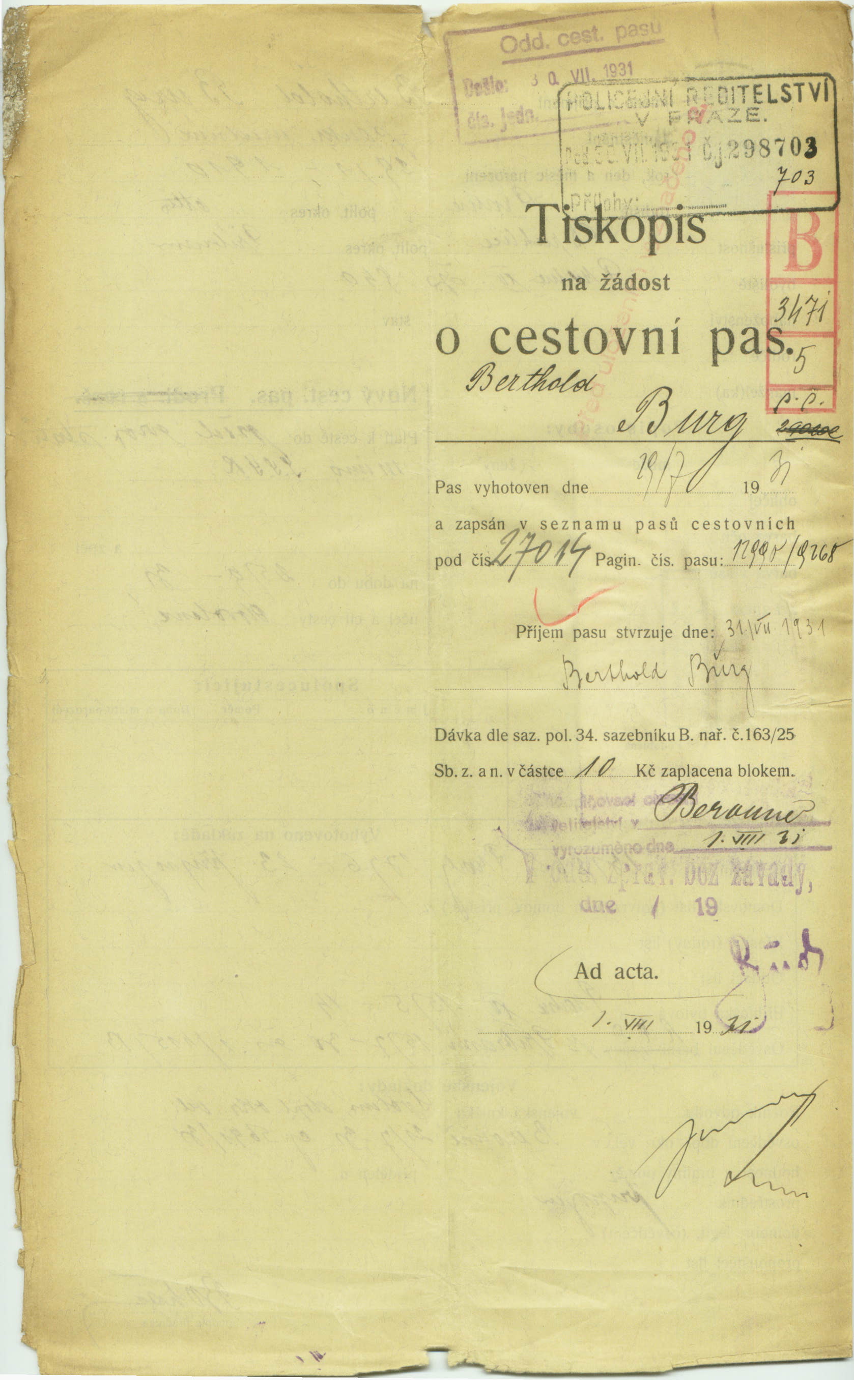 Passport application of Berthold Burg