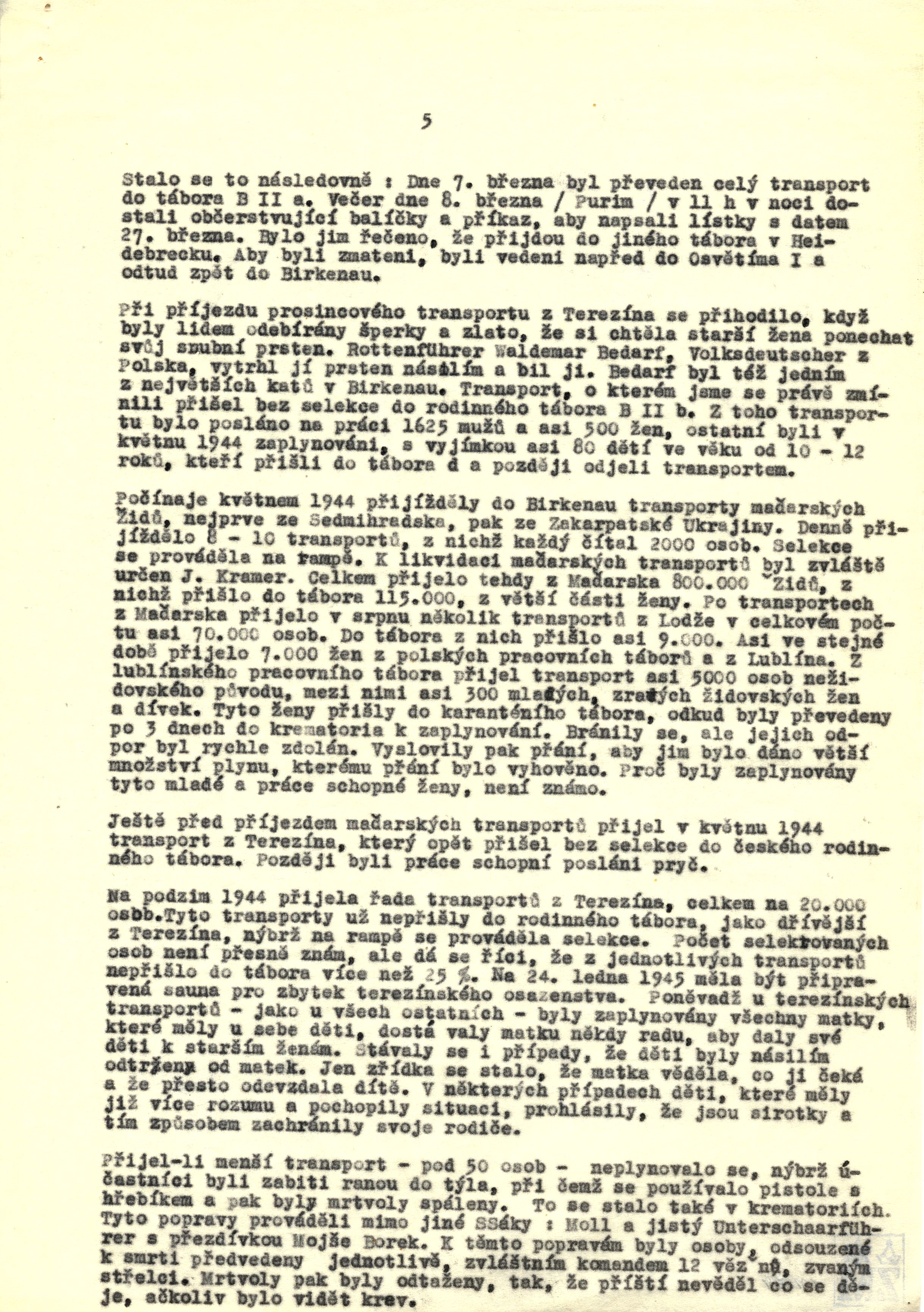 During the arrival of the December transport from Theresienstadt, when the people were having their jewelry and gold taken away, an older woman wanted to keep her wedding ring. Rottenführer Waldemar Bedarf, a Volksdeutscher from Poland, violently pulled her ring off and beat her. Bedarf was one of the leading executioners in Birkenau. The transport that I have just mentioned was taken to Family Camp B II b without going through the selection process. One thousand six hundred and twenty five men and about 500 women from this transport were sent to work and the rest were gassed in May 1944, with the exception of roughly 80 children aged 10-12, who arrived at Camp D and later departed on another transport.