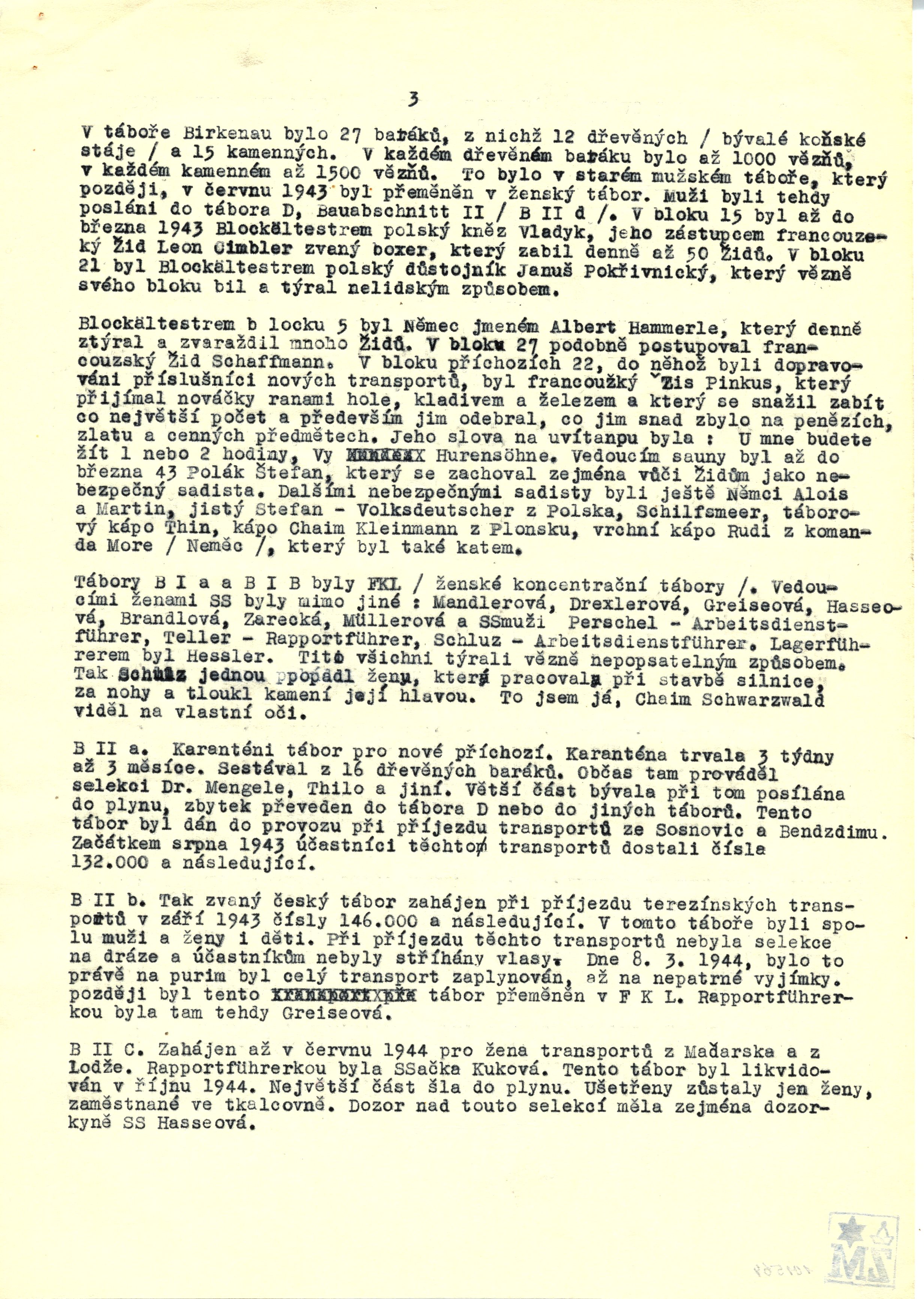 Tábory B I a B I B byly FKL / ženské koncentrační tábory /. Vedoucími ženami SS byly mimo jiné: Mandlerová, Drexlerová, Greiseová, Hasseová, Brandlová, Zarecká, Müllerová a SS muži Perschel – Arbeitsdienstführer, Teller – Rapportführer, Schulz – Arbeitsdienstführer. Lagerführerem byl Hössler. Tito všichni týrali vězně nepopsatelným způsobem. Tak Schulz jednou popadl ženu, která pracovala při stavbě silnice, za nohy a tloukl kamení její hlavou. To jsem já, Chaim Schwarzwald viděl na vlastní oči.