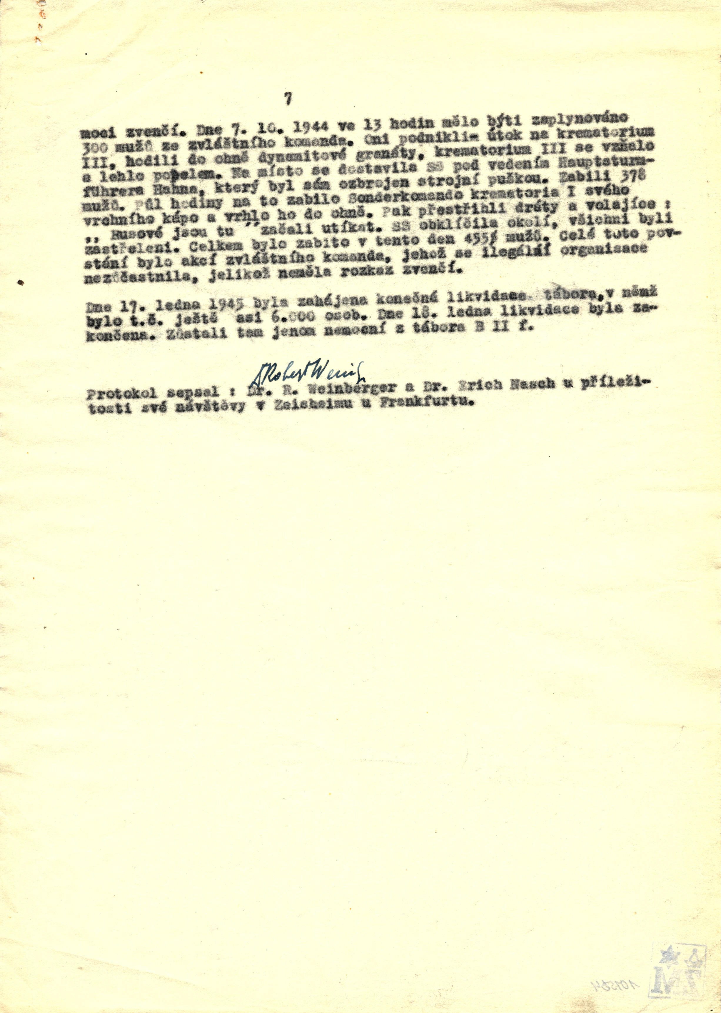 Protokol sepsal: Dr. Robert Weinberger a Dr. Erich Nasch u příležitosti své návštěvy v Zeilsheimu u Frankfurtu.