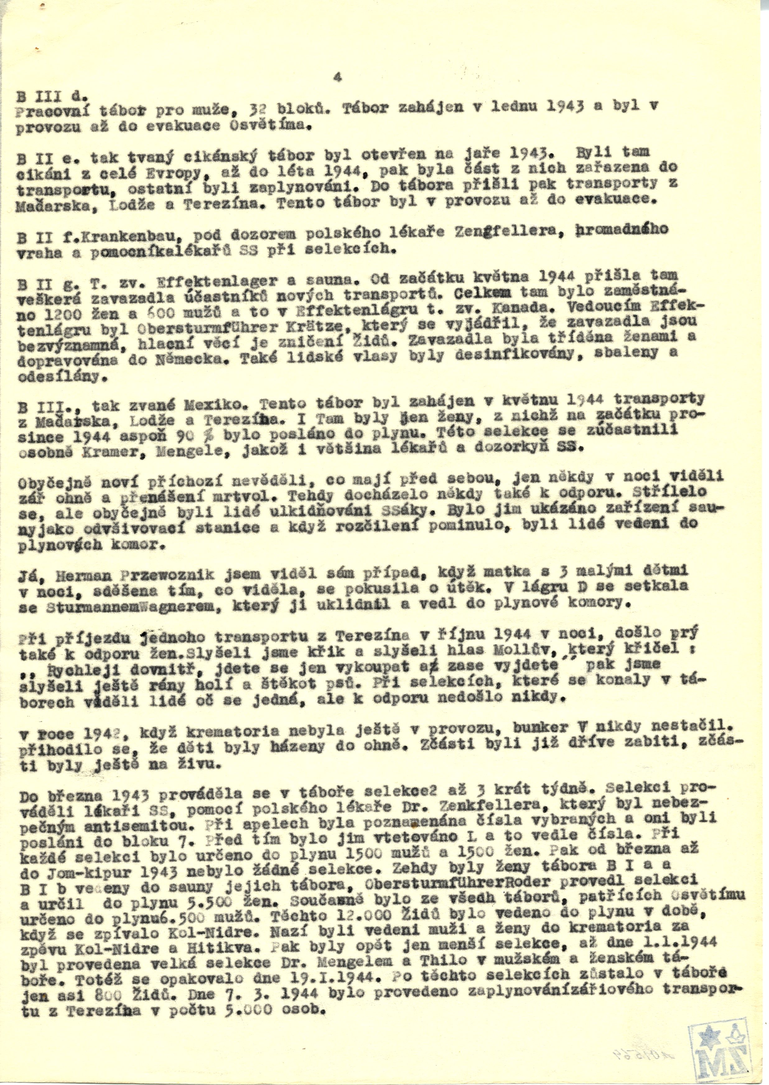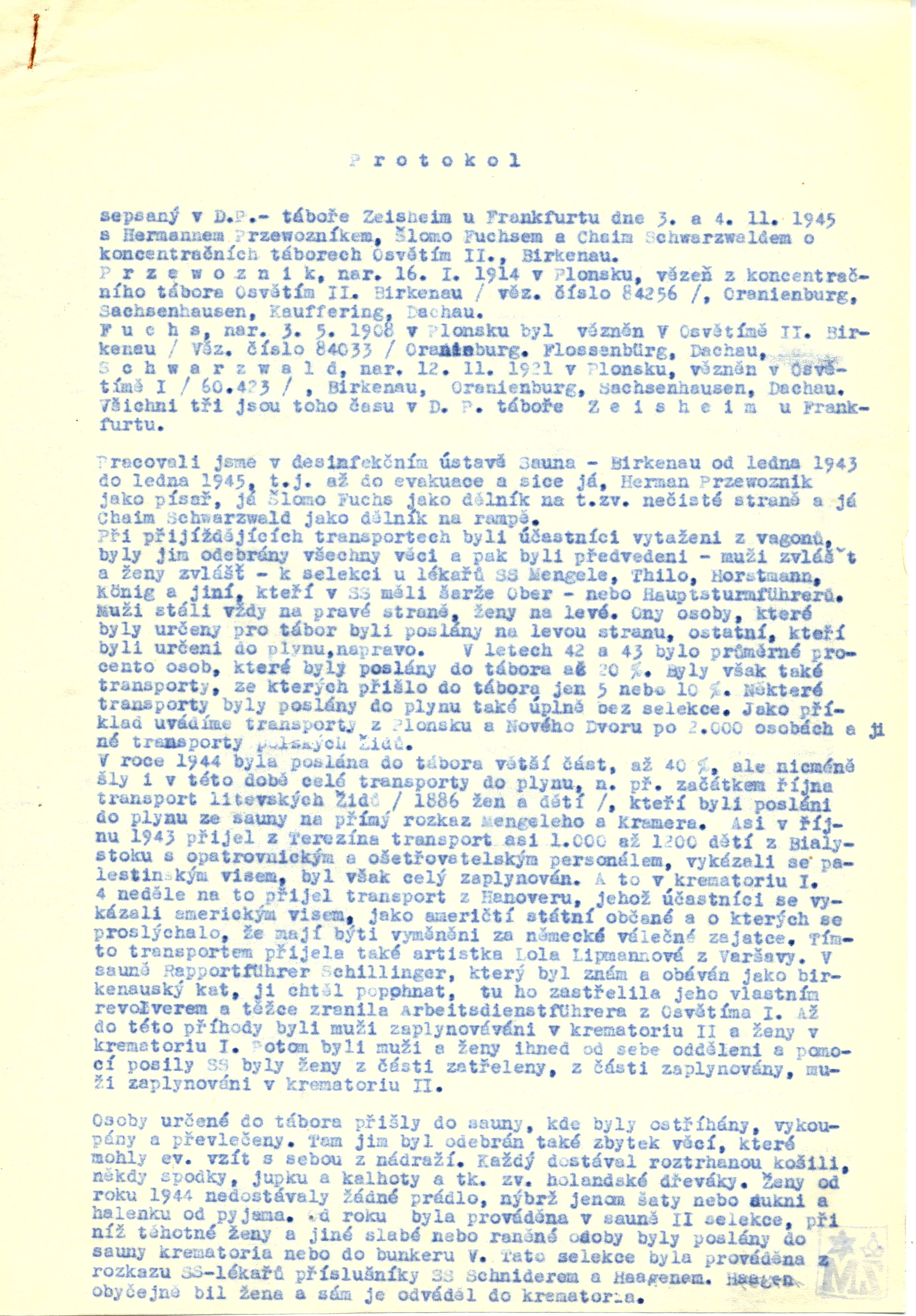 sepsaný v D.P.– táboře Zeilsheim u Frankfurtu dne 3. a 4. 11. 1945 s Hermannem Przewozníkem, Šlomo Fuchsem a Chaim Schwarzwaldem o koncentračních táborech Osvětím II., Birkenau.