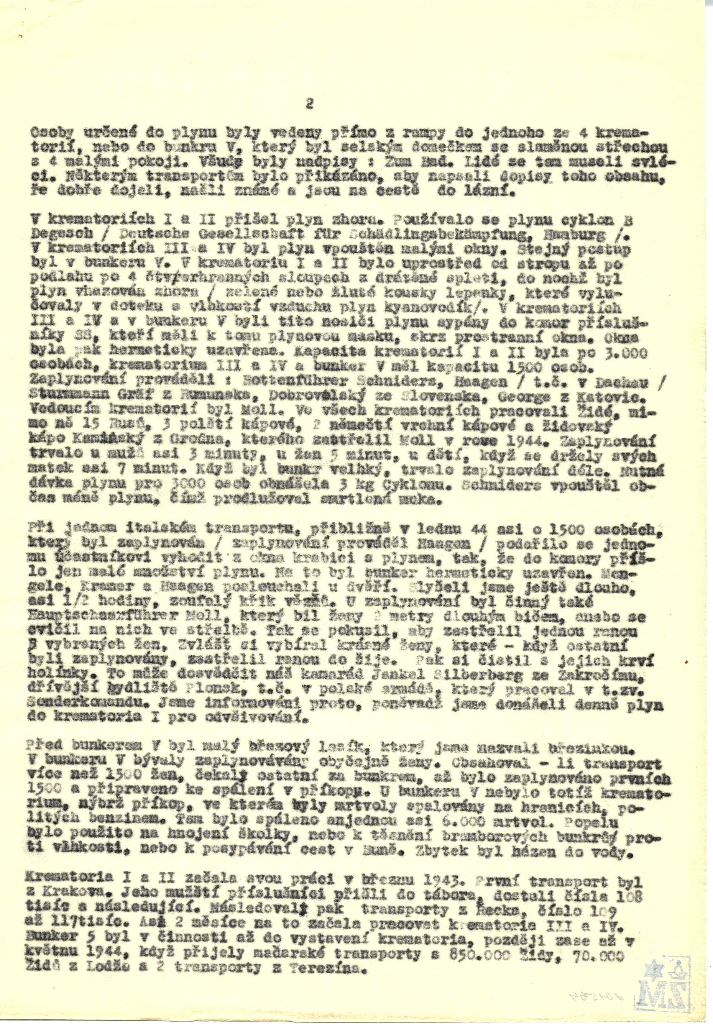 Při jednom italském transportu, přibližně v lednu 44 asi o 1500 osobách, který byl zaplynován / zaplynování prováděl Haagen / podařilo se jednomu účastníkovi vyhodit z okna krabici s plynem, tak, že do komory přišlo jen malé množství plynu. Na to byl bunker hermeticky uzavřen. Mengele, Kramer a Haagen poslouchali u dvěří. Slyšeli jsme ještě dlouho, asi ½ hodiny, zoufalý křik vězňů. U zaplynovaných byl činný také Hauptschaarführer Moll, který bil ženy 2 metry dlouhým bičem, anebo se cvičil na nich ve střelbě. Tak se pokusil, aby zastřelil jednou ranou 5 vybraných žen. Zvlášť si vybíral krásné ženy, které – když ostatní byly zaplynovány, zastřelil ranou do šíje. Pak si čistil s jejich krví holínky. To může dosvědčit náš kamarád Jankel Silberberg ze Zákročímu, dřívější bydliště Plonsk, t.č. v polské armádě, který pracoval v t.zv. Sonderkommandu. Jsme informováni proto, poněvadž jsme donášeli denně plyn do krematoria pro odvšivování.