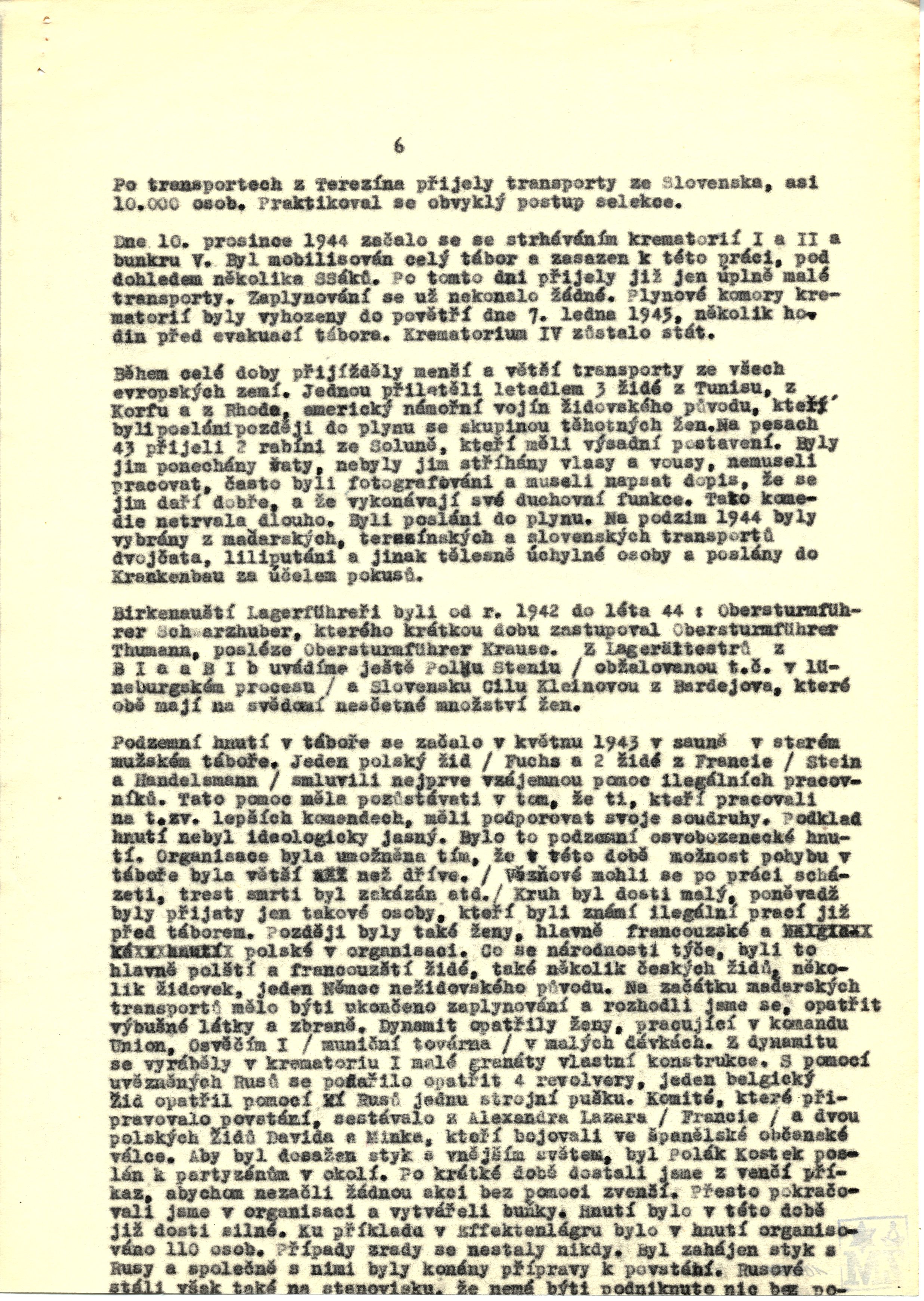 The underground movement in the camp began in May 1943 in the sauna in the old men’s camp. One Polish Jew (Fuchs) and 2 Jews from France (Stein and Handelsmann) first agreed to mutually help illegal workers. Those who worked in the so-called better commandos agreed to help their comrades. The movement did not have a clear ideology. It was an underground liberation movement. The organization could exist because at the time people could move around the camp with greater freedom than before (prisoners could meet after work, the death penalty was banned, etc.) Their membership was small because they only accepted people who were known to have performed illegal work before arriving in the camp. Later, the organization also contained women, mainly French and Polish. In terms of nationality, its members were mainly Polish and French Jews, there were also several Czech Jews, several Jewish women, and one German who was not a Jew. When the Hungarian transports began to arrive, gassing was supposed to cease and so we decided to procure explosives and weapons. The women who worked in the Union commando, Auschwitz I (a munitions factory), acquired dynamite in small doses. The dynamite was used to make small handmade grenades in Crematorium I. With the help of Russian prisoners, we managed to acquire 4 revolvers. One Belgian Jew got a machine gun with the help of the Russians. The committee that orchestrated the uprising was composed of Alexandre Lazar (France) and two Polish Jews, David and Minko, who fought in the Spanish Civil War. To establish contact with the outside world, the Pole Kostek was sent to the join the partisans in the area. We soon received an order from the outside that we shouldn’t start anything without outside help. Nevertheless, we continued organizing and creating cells. The movement was rather strong at the time. For example, in the Effektenlager 110 people were part of the movement. We were never betrayed. We got in touch with the Russians and began planning an uprising. But the Russians were also of the opinion that we shouldn’t prepare anything more without