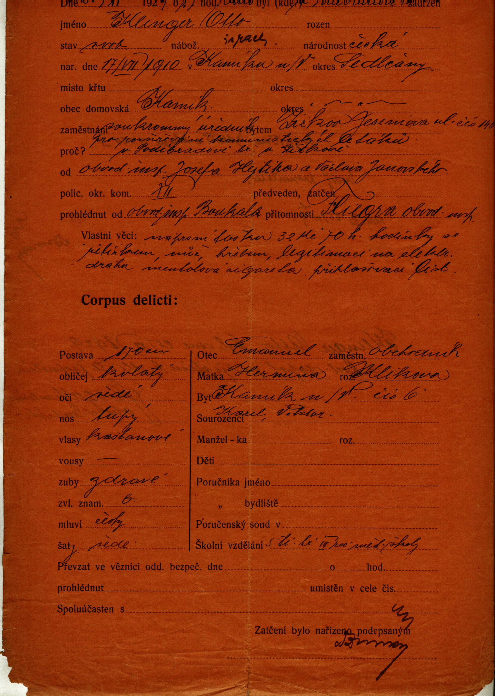Arrest record of Ota Klinger for dissemination of communist flyers