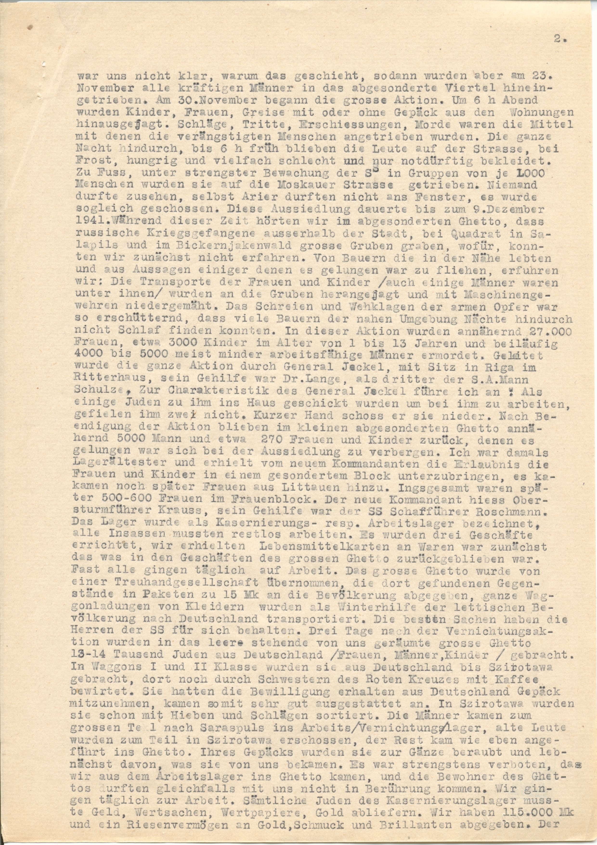 die grosse Aktion. Um 6 h Abend wurden Kinder, Frauen, Greise mit oder ohne Gepäck aus den Wohnungen hinausgejagt. Schläge, Tritte, Erschiessungen, Morde waren die Mittel, mit denen die verängstigten Menschen angetrieben wurden. Die ganze Nacht hindurch, bis 6 h früh blieben die Leute auf der Strasse, bei Frost, hungrig und vielfach schlecht und nur notdürftig bekleidet. Zu Fuss, unter strengster Bewachung der SS in Gruppen von je 1000 Menschen wurden die auf die Moskauer Strasse getrieben. Niemand durfte zusehen, selbst Arier durften nicht ans Fenster, es wurde sogleich geschossen. Diese Aussiedlung dauerte bis zum 9. Dezember 1941. Während dieser Zeit hörten wir im abgesonderten Ghetto, dass russische Kriegsgefangene ausserhalb der Stadt, bei Quadrat in Salaspils und im Bickernjakenwald grosse Gruben graben, wofür, konnten wir zunächst nicht erfahren. Von Bauern, die in der Nähe lebten und aus Aussagen einiger, denen es gelungen war zu fliehen, erfuhren wir: Die Transporte der Frauen und Kinder (auch einige Männer waren unter ihnen) wurden an die Grube herangejagt und mit Maschinengewehren niedergemäht. Das Schreien und Wehklagen der armen Ofer war so erschütternd, dass viele Bauern der nahen Umgebung Nächte hindurch nicht Schlaf finden konnten. In dieser Aktion wurden annährend 27.000 Frauen, etwa 3000 Kinder im Alter von 1 bis 13 Jahren und beiläufig 4000 bis 5000 meist minder arbeitsfähige Männer ermordet. Geleitet wurde die ganze Aktion durch General Jeckeln, mit Sitz in Riga im Ritterhaus, sein Gehilfe war Dr. Lange, als dritter der S.A. Mann Schulze. Zur Charakteristik des General Jeckeln führe ich an: Als einige Juden zu ihm ins Haus geschickt wurden, um bei ihm zu arbeiten, gefielen ihm zwei nicht. Kurzer Hand schoss er sie nieder. Nach Beendigung der Aktion blieben im kleinen abgesonderten Ghetto annähernd 5000 Mann und etwa 270 Frauen und Kinder zurück, denen es gelungen war, sich bei der Aussiedlung zu verbergen. Ich war damals Lagerältester und erhielt vom neuen Kommandanten die Erlaubnis, die Frauen und Kinder in einem gesonderten Block unterzubringen, es kamen noch später Frauen aus Litauen hinzu. Insgesamt waren später 500-600 Frauen im Frauenblock. Der neue Kommandant hiess Obersturmführer Krauss, sein Gehilfe was der SS Scharführer Roschmann. Das Lager wurde ans Kasernierungs- resp. Arbeitslager bezeichnet, alle Insassen mussten restlos arbeiten. Es wurden drei Geschäfte errichtet, wir erhielten Lebensmittelkarten, an Waren war zunächst das, was in den Geschäften des grossen Ghetto zurückgeblieben war. Fast alle gingen täglich auf Arbeit. Das grosse Ghetto wurde von einer Treuhandgesellschaft übernommen, die dort gefundenen Gegenstände in Paketen zu 15 Mk an die Bevölkerung abgegeben, ganze Waggonladungen von Kleidern wurde als Winterhilfe der lettischen Bevölkerung nach Deutschland transportiert. Die besten Sachen haben die Herren der SS für sich behalten. Drei Tage nach der Vernichtungsaktion wurden in das leer stehende von uns geräumte grosse Ghetto 13-14 Tausend Juden aus Deutschland (Frauen, Männer,Kinder gebracht. In Waggons I und II Klasse wurden sie aus Deutschland bis Szirotowa gebracht, dort noch durch Schwestern des Roten Kreuzes mit Kaffee bewirtet. Sie hatten die Bewilligung erhalten, aus Deutschland Gepäck mitzunehmen, kamen somit sehr gut ausgestattet an. In Szirotowa wurden sie schon mit Hieben und Schlägen sortiert. Die Männer kamen zum grossen Teil nach Salaspils ins Arbeits/Vernichtungs/lager, alte Leute wurden zum Teil in Szirotowa erschossen, der Rest kam wie eben angeführt ins Ghetto. Ihres Gepäckes wurden sie zur Gänze beraubt und lebnächst [sic!] davon, was sie von uns bekamen. Es war strengstens verboten, dass wir aus dem Arbeitslager ins Ghetto kamen, und die Bewohner des Ghettos durften gleichfalls mit uns nicht in Berührung kommen. Wir gingen täglich zur Arbeit. Sämtliche Juden des Kasernierungslager mussten Geld, Wertsachen, Wertpapiere, Gold abliefern. Wir haben 115.000 Mk und ein Riesenvermögen an Gold, Schmuck und Brillianten abgegeben. Der