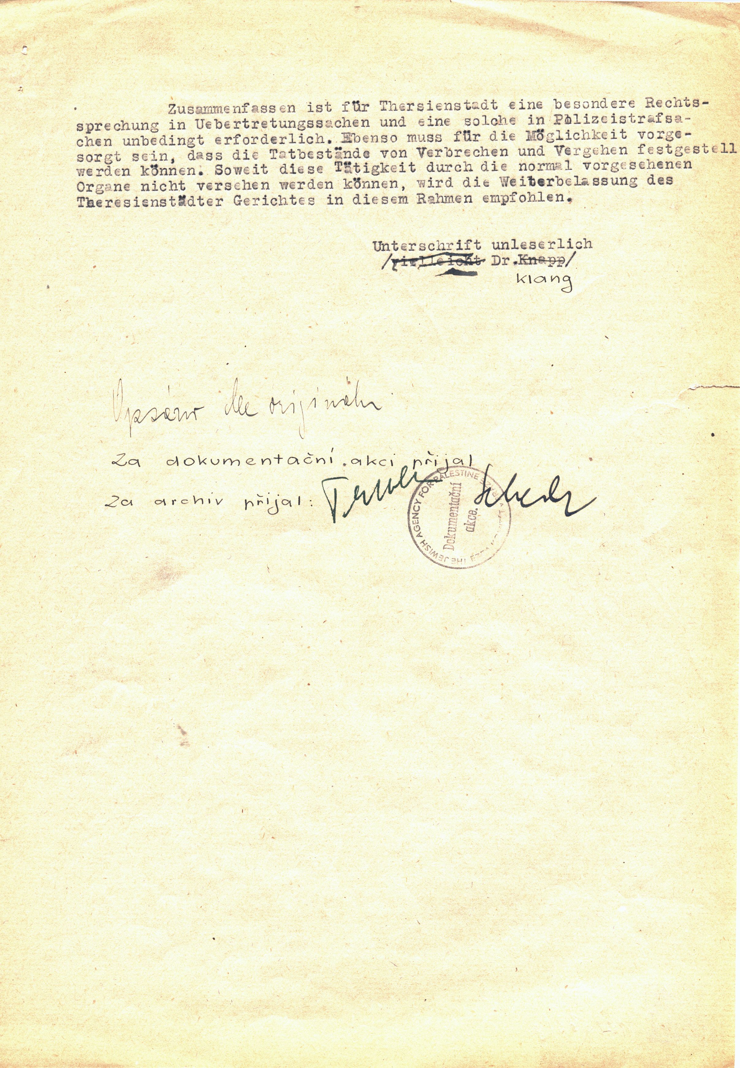 Zusammenfassen ist für Theresienstadt eine besondere Rechtsprechung und Uebertretungssachen und eine solche in Polizeistrafsachen unbedingt erforderlich. Ebenso muss für die Möglichkeit vorgesorgt sein, dass die Tatbestände von Verbrechen und Vergehen festgestellt werden können. Soweit diese Tätigkeit durch die normal vorgesehenen Organe nicht versehen werden können, wird die Weiterbelassung des Theresienstädter Gerichtes in diesem Rahmen empfohlen.