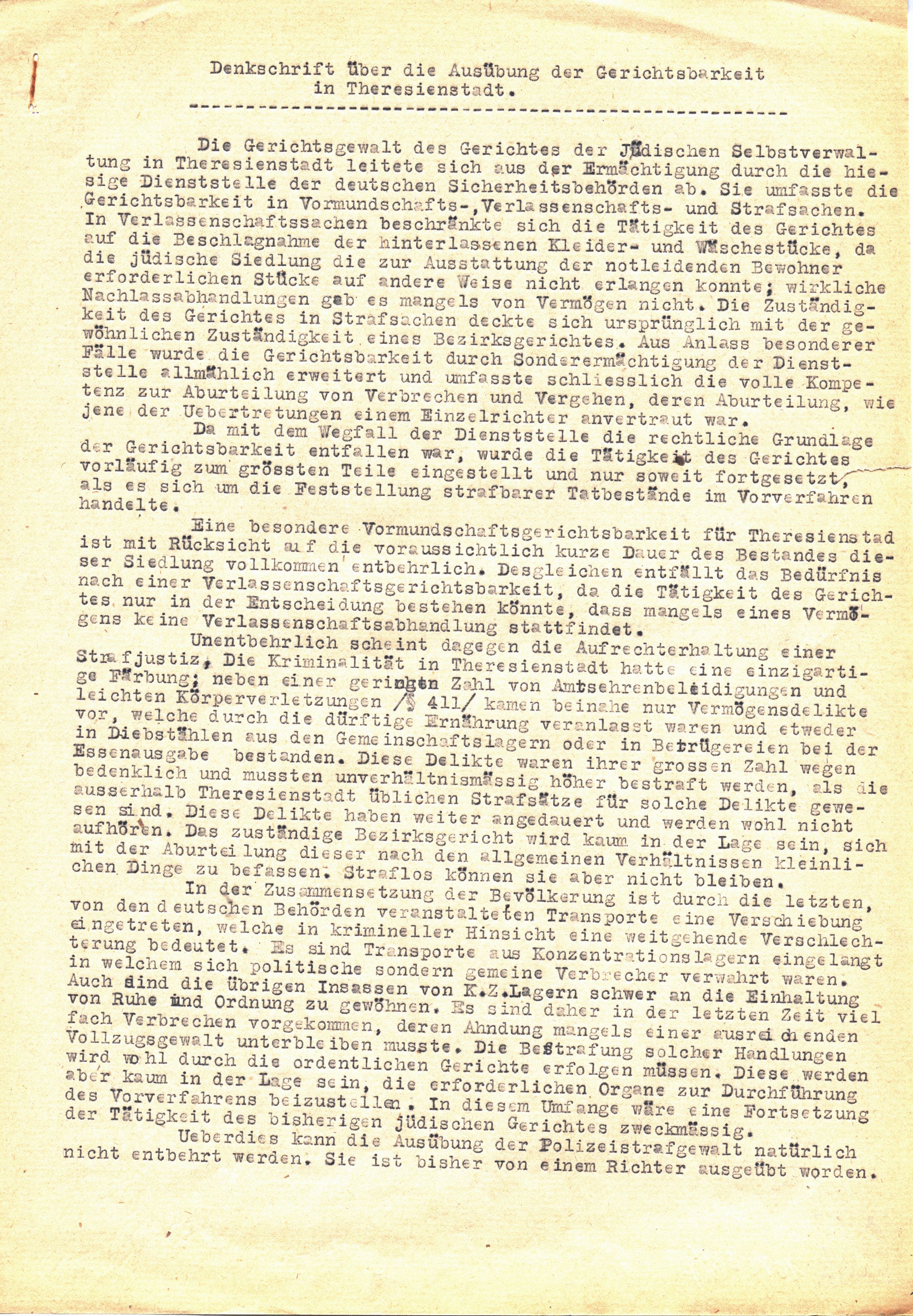 Die Gerichtsbarkeit des Gerichtes der Jüdischen Selbstverwaltung in Theresienstadt leitete sich aus der Ermächtigung durch die hiesige Dienststelle der deutschen Sicherheitsbehörden ab. Sie umfasste die Gerichtsbarkeit in Vormundschafts-, Verlassenschafts- und Strafsachen. In Verlassenschaftssachen beschränkte sich die Tätigkeit des Gerichtes auf die Beschlagnahme der hinterlassenen Kleider- und Wäschestücke, da die jüdische Siedlung die zur Ausstattung der notleidenden Bewohner erforderlichen Stücke auf andere Weise nicht erlangen konnte; wirkliche Nachlassbehandlungen gab es mangels von Vermögen nicht. Die Zuständigkeit des Gerichtes in Strafsachen deckte sich ursprünglich mit der gewöhnlichen Zuständigkeit eines Bezirksgerichtes. Aus Anlass besonderer Fälle wurde die Gerichtsbarkeit durch Sonderermächtigung der Dienststelle allmählich erweitert und umfasste schliesslich die volle Kompetenz zur Aburteilung von Verbrechen und Vergehen, deren Aburteilung, wie jene der Uebertretungen einem Einzelrichter anvertraut war.