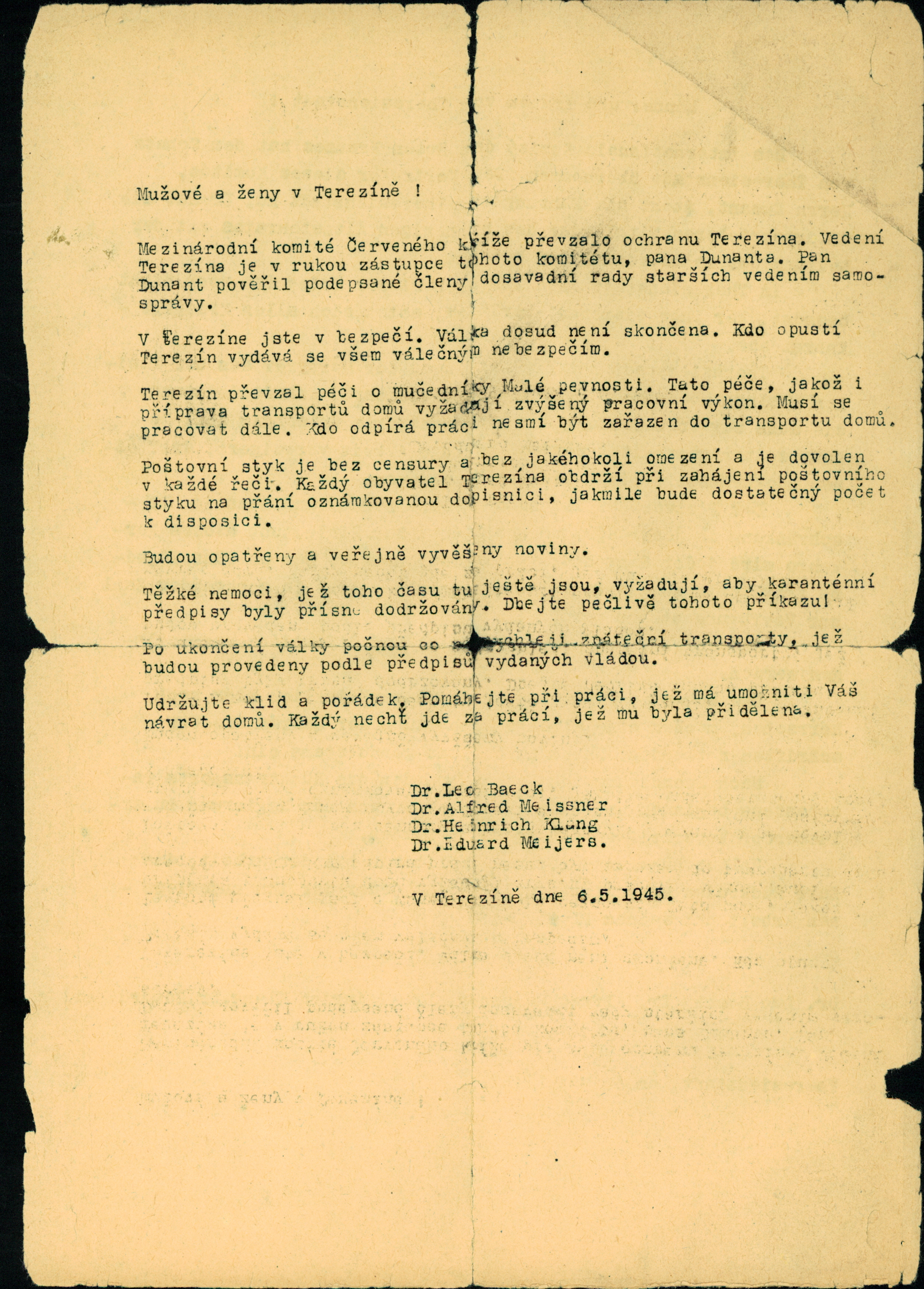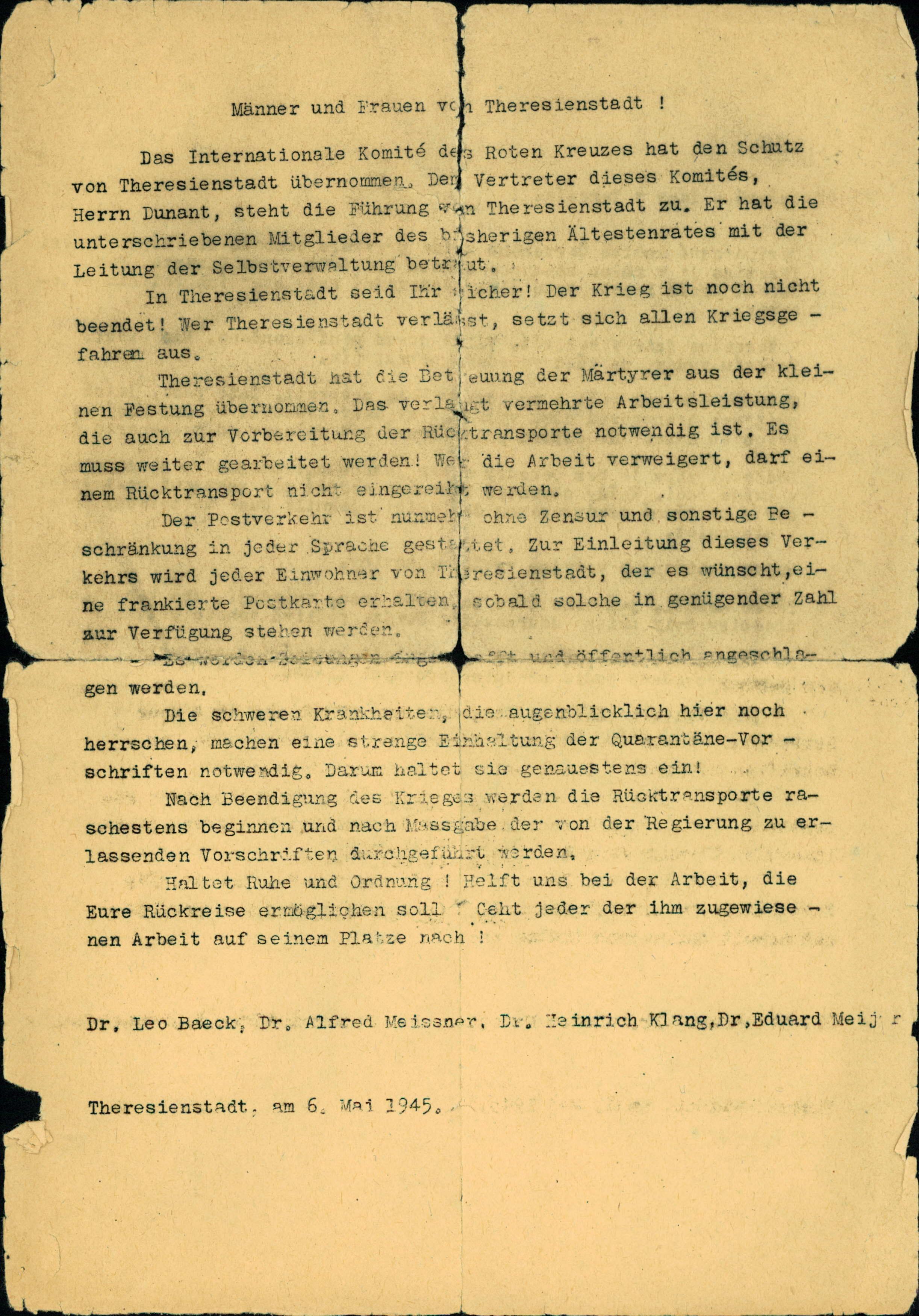 Announcement of the ICRC taking over control over the Theresienstadt ghetto