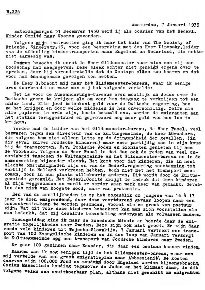 Volgens mijn instructies ging ik naar het huis van The Society of Friends, Singerstr. 16, voor een bespreking met den Heer Lipopsky, leider van de afdeeling kindertransporten naat Engeland en Nederland, die echter niet aanwezig was.
