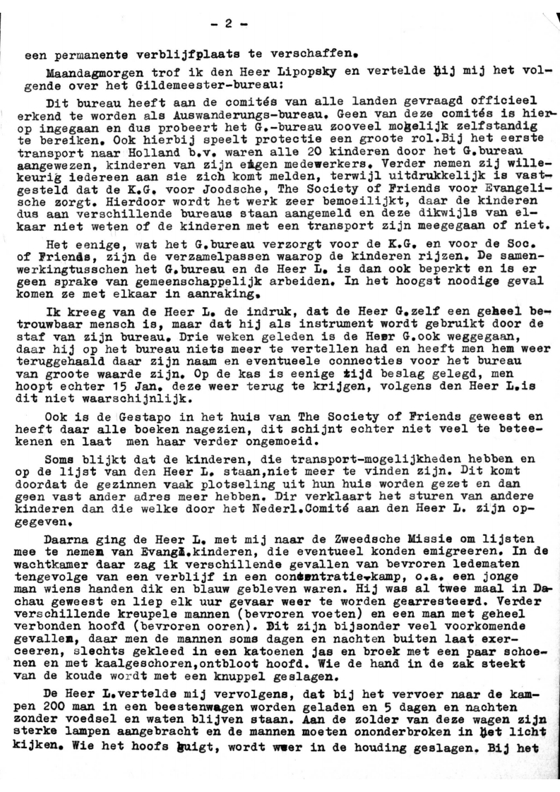 Verder had de leider van het Gildemeester-bureau, de heer Fasal, veel bezwaren tegen den directeur van de Kultusgemeinde, die Heer Löwenherz, die volgens hem niet alleen lette op de dringendheid der gevallen, (in dir geval zuiver Joodsche kinderen) maar zeer partijdig was in zijn keus bij de transporten. b.v. Poolsche Joden en Zionisten genieten bij hem eenigheid tusschen de Kultusgemeinde en het Gildemeester-bureau en is de samenwerking bijzonder slecht. Het komt voor dat kinderen, die in heel slechte omstandigheden zijn en van de Nederl. regeering toestemming tot verblijf in Holland verkregen hebben, toch niet met het transport meekomen, doch in hun plaats willekeurig anderen. Dit wordt door de Kultusgemeinde geregeld. Het Nederl. Comite krijgt de indruk dat deze kinderen al zijn weggezonden en wordt er verder geen werk meer van gemaakt. Gevallen dus niet van hoogste nood, maar van protectie.