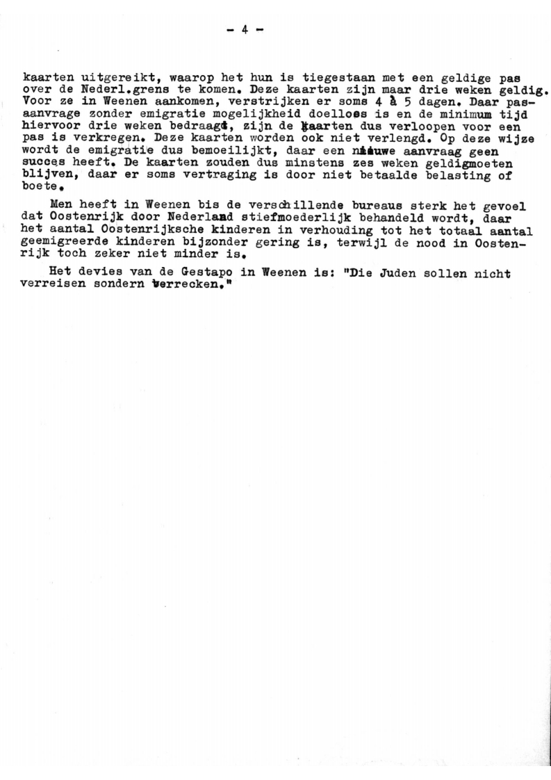 kaarten uitgereikt, waarop het hun is tiegestaan met een geldige pas over de Nederl. grens te komen. Deze kaarten zijn maar drie weken geldig. Voor ze in Weenen aankomen, vrestrijken er soms 4 a 5 dagen. Daar passaanvrage zonder emigratie mogelijkheid doelloss is en de minimum tijd hiervoor drie weken bedraagd, zijn de kaarten dus verloopen voor een pas is verkregen. Deze kaarten worden ook niet verlengd. Op deze wijze succes heeft. De kaarten zouden dus minstens zes weken geldigmoeten blijven, daar er soms vertraging is door niet betaalde belasting of boete.