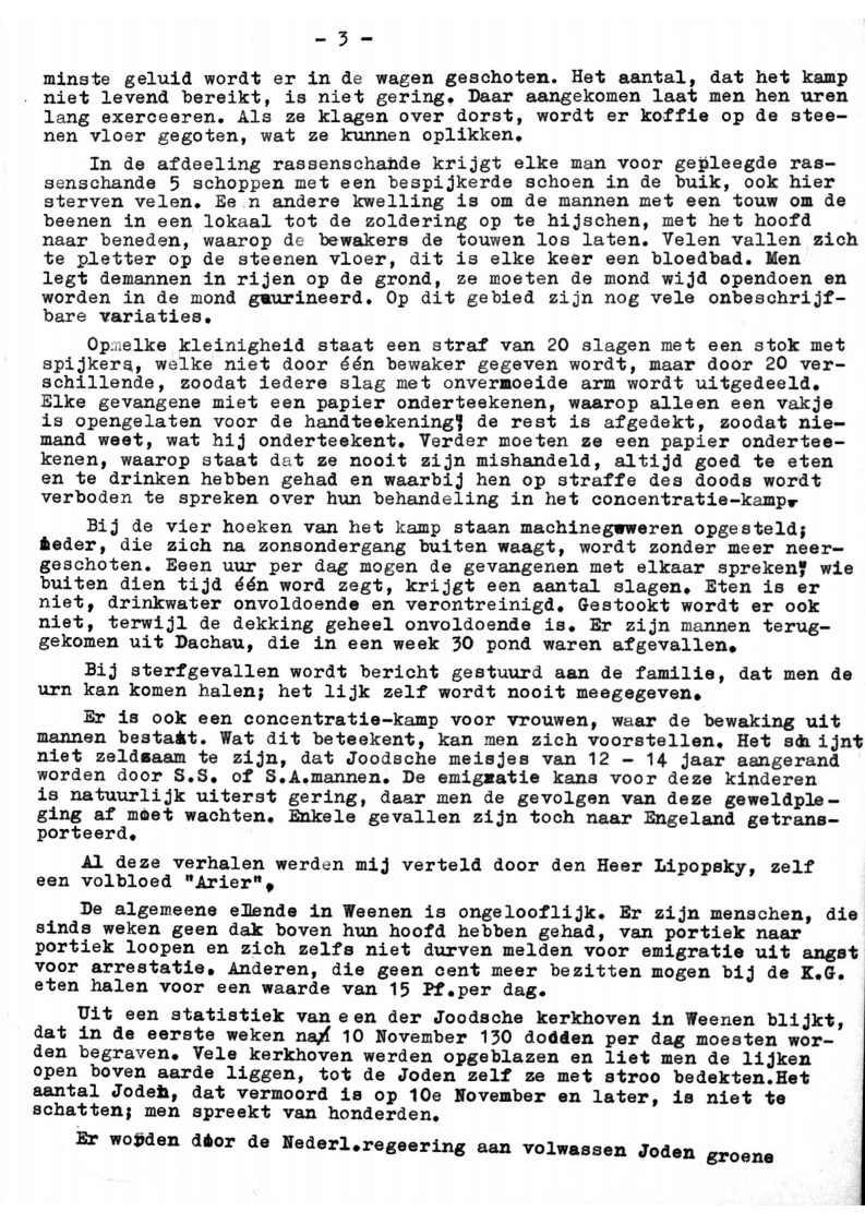 De Heer L. Vertelde mij vervolgens, dat bij het vervoer naar de kampen 200 man in een beestenwagen worden geladen en 5 dagen en nachten zonder voedsel en waten blijven staan. Aan de zolder van deze wagen zijn sterke lampen aangebracht en de mannen moeten ononderbroken in het licht kijken. Wie het hoofs guigt, wordt wer in de houding geslagen. Bij het