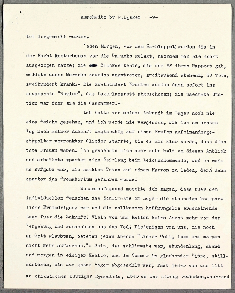 Ich hatte vor meiner Ankunft im Lager noch nie eine Leiche gesehen, und ich werde nie vergessen, wie ich am ersten Tag nach meiner Ankunft unglaeubig auf einen Haufen aufeinandergestapelter verrenkter Glieder starrte, bis es mir klar wurde, dass dies tote Frauen waren. Ich gewoehnte mich aber sehr bald an diesen Anblick und arbeitete spaeter eine Zeitlang beim Leichenkommando, wo es meine Aufgabe war, die nackten Toten auf einen Karren zu laden, der dann spaeter ins Krematorium gefahren wurde.