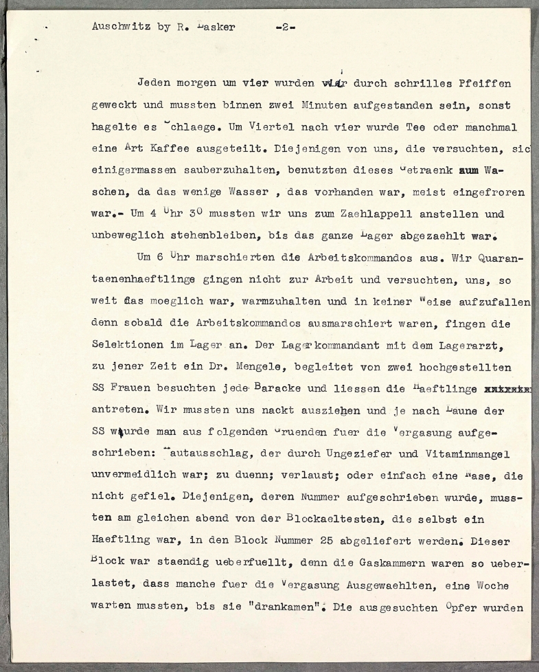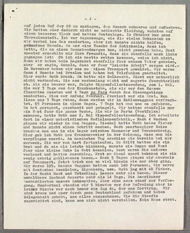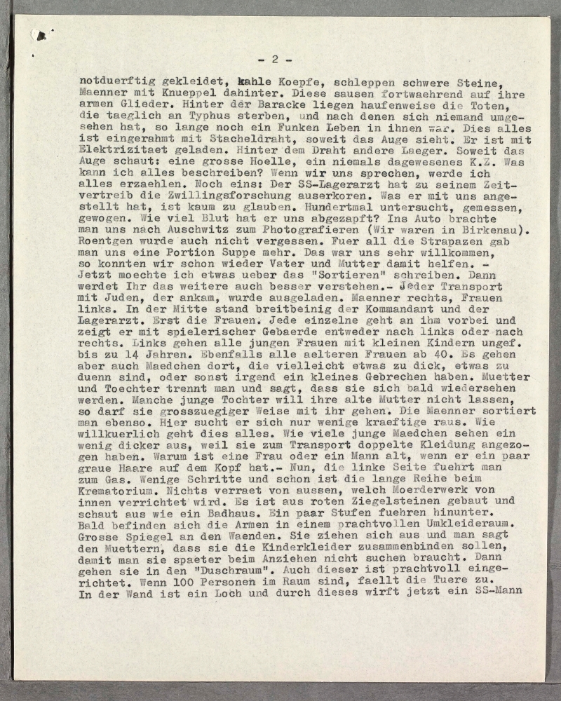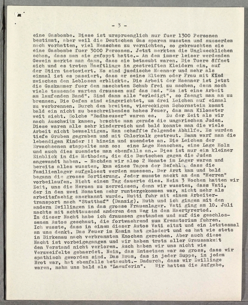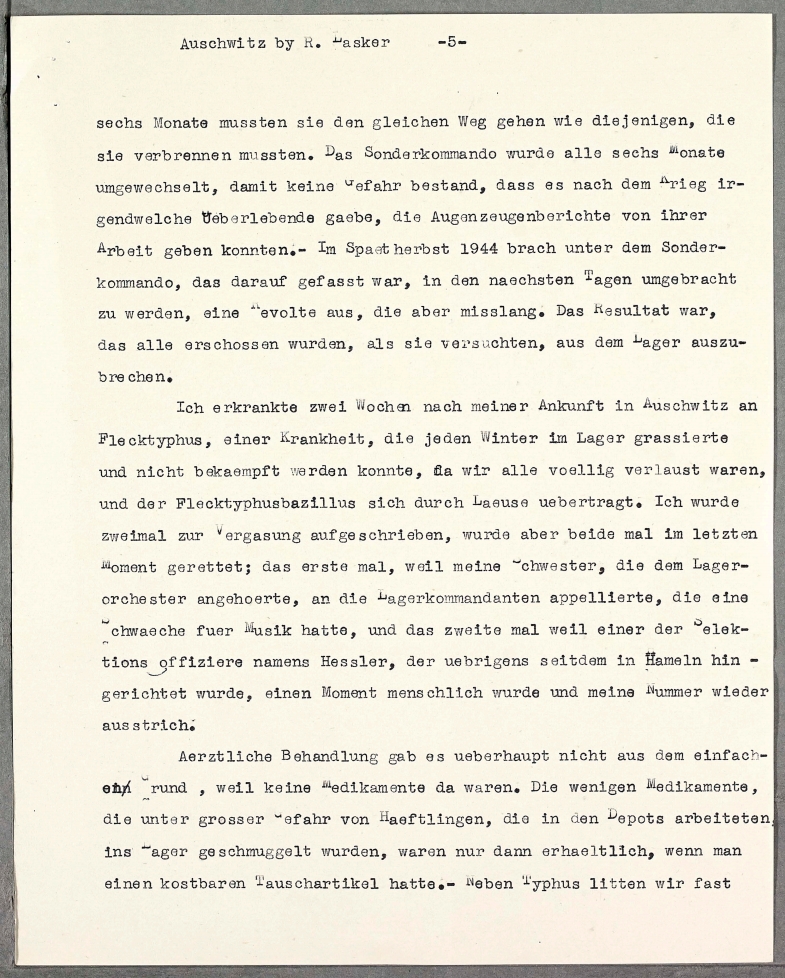 Ich erkrankte zwei Wochen nach meiner Ankunft in Auschwitz an Flecktyphus, einer Krankheit, die jeden Winter im Lager grassierte und nicht bekaempft werden konnte, da wir alle voellig verlaust waren, und der Flecktyphusbazillus sich durch Laeuse uebertragt. Ich wurde zweimal zur Vergasung aufgeschrieben, wurde aber beide mal im letzten Moment gerettet; das erste mal, weil meine Schwester, die dem Lagerorchester angehoerte, an die Lagerkommandanten appellierte, die eine schwaeche fuer Musik hatte [sic!], und das zweite mal weil einer der Selektionsoffiziere namens Hessler, der uebrigens seitdem in Hameln hingerichtet wurde, einen Moment menschlich wurde und meine Nummer wieder ausstrich.