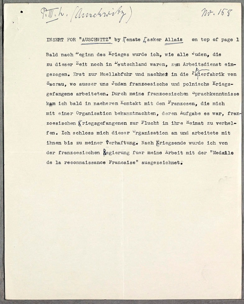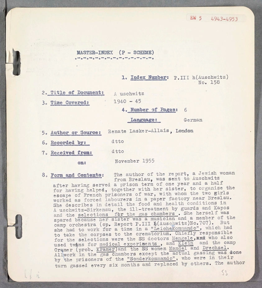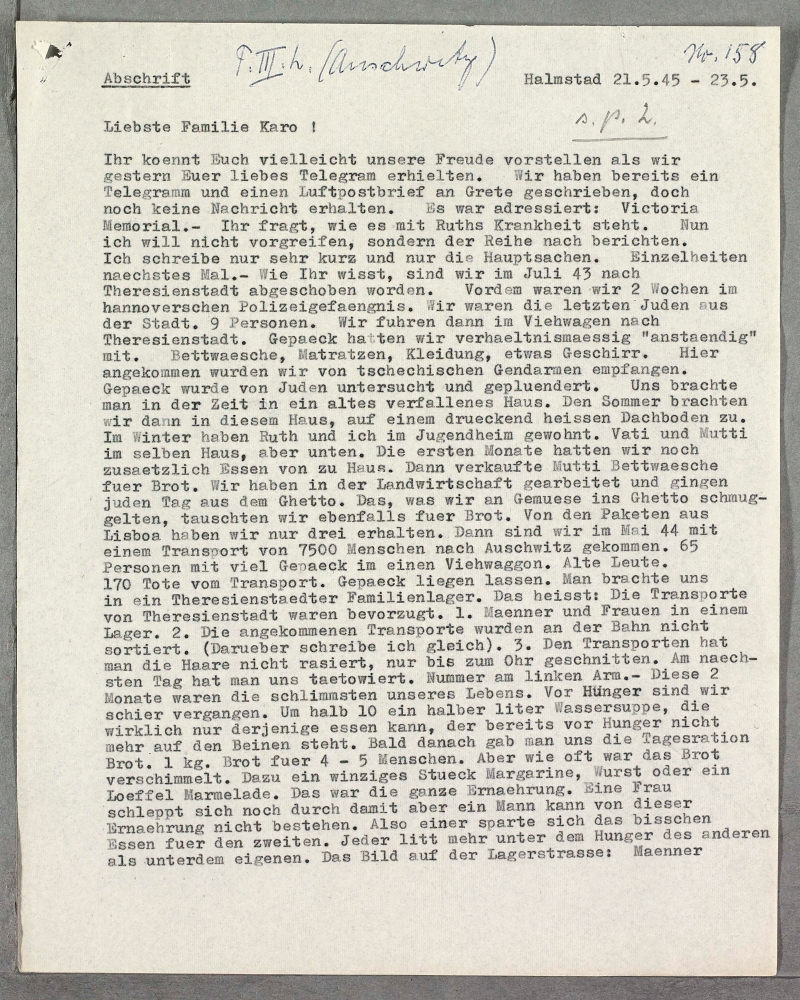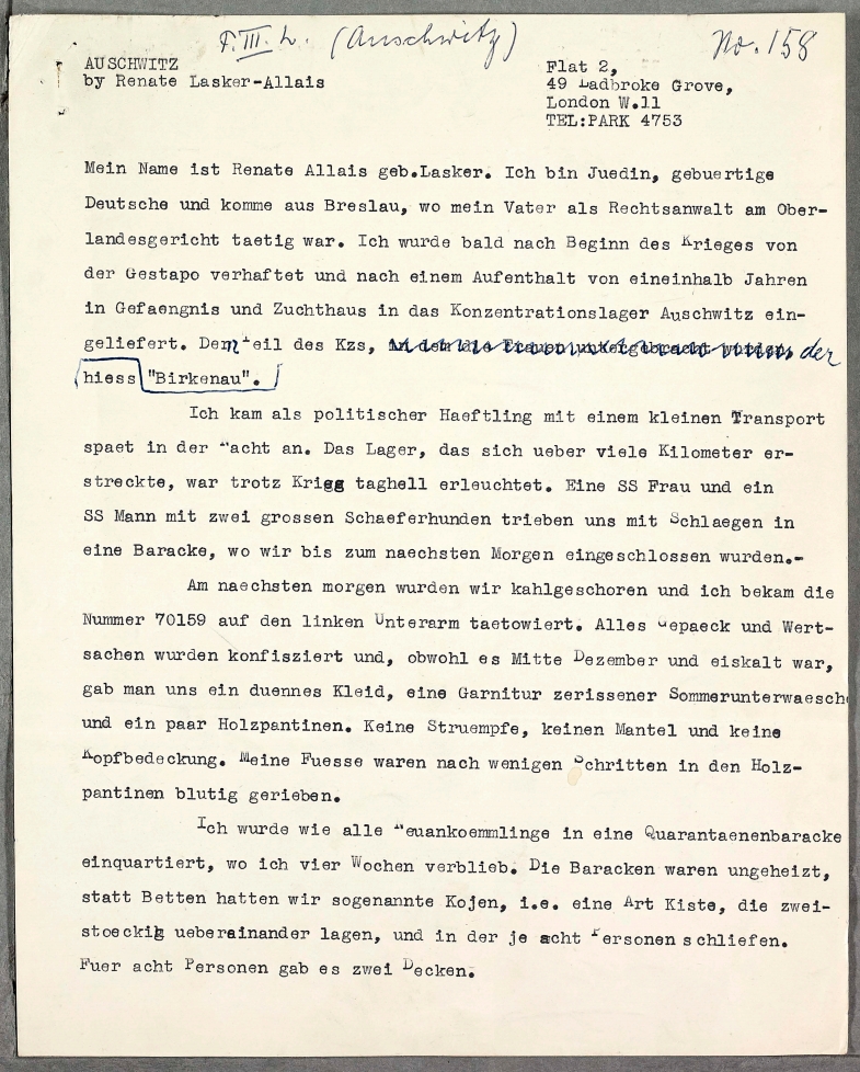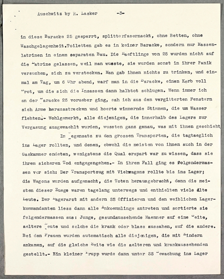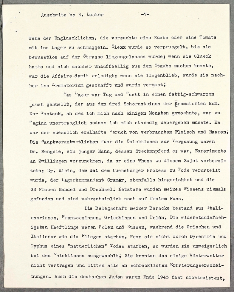 Ich erkrankte zwei Wochen nach meiner Ankunft in Auschwitz an Flecktyphus, einer Krankheit, die jeden Winter im Lager grassierte und nicht bekaempft werden konnte, da wir alle voellig verlaust waren, und der Flecktyphusbazillus sich durch Laeuse uebertragt. Ich wurde zweimal zur Vergasung aufgeschrieben, wurde aber beide mal im letzten Moment gerettet; das erste mal, weil meine Schwester, die dem Lagerorchester angehoerte, an die Lagerkommandanten appellierte, die eine schwaeche fuer Musik hatte [sic!], und das zweite mal weil einer der Selektionsoffiziere namens Hessler, der uebrigens seitdem in Hameln hingerichtet wurde, einen Moment menschlich wurde und meine Nummer wieder ausstrich.