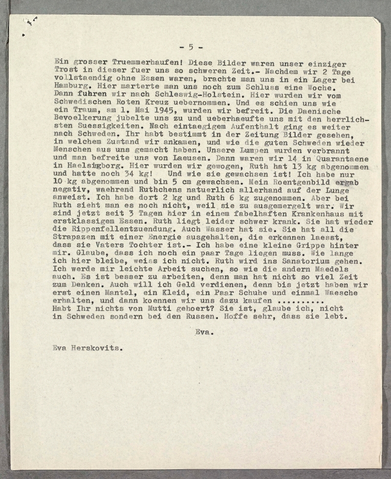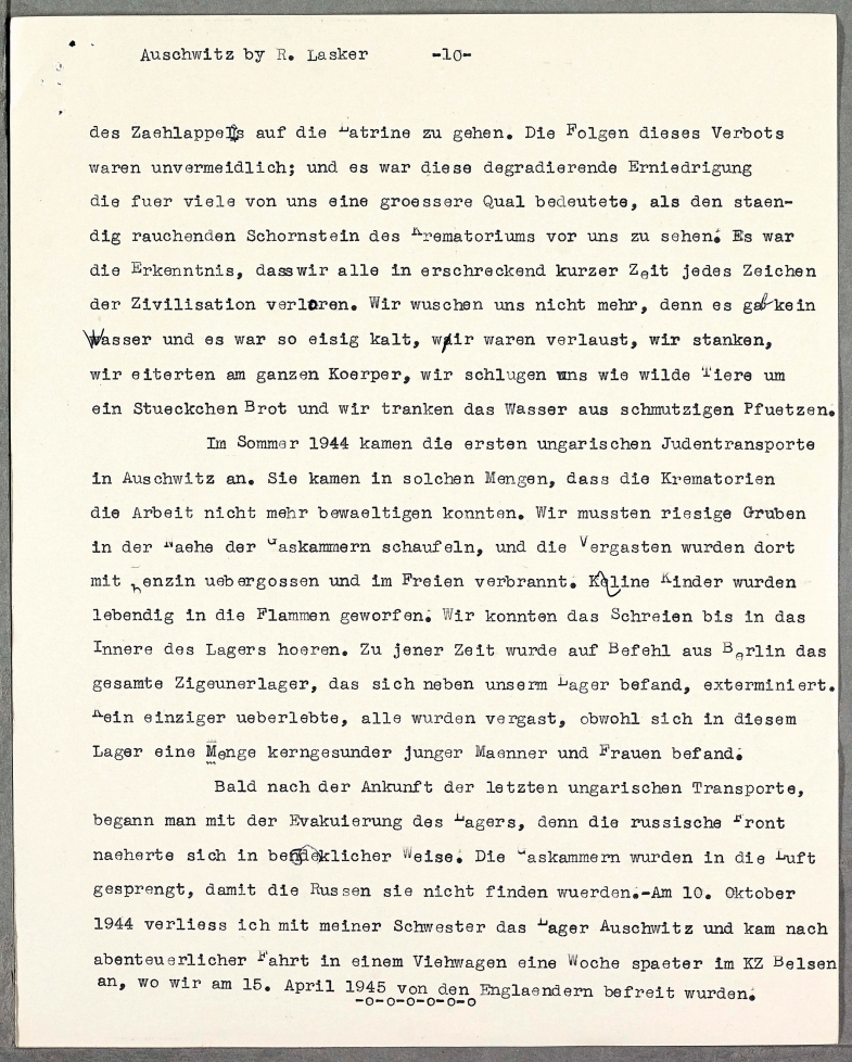 Bald nach der Ankunft der letzten ungarischen Transporte, begann man mit der Evakuierung des Lagers denn die russische Front naeherte sich in bendeklicher Weise. Die Gaskammern wurden in die Luft gesprengt, damit die Russen sie nicht finden wuerden.-Am 10. Oktober 1944 verliess ich mit meiner Schwester das Lager Auschwitz und kam nach abenteuerlicher Fahrt in einem Viehwagen eine Woche spaeter im KZ Belsen an, wo wir am 15. April 1945 von den Englaendern befreit wurden.