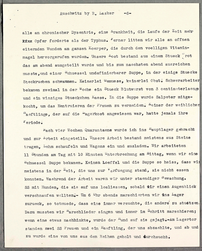 Nach vier Wochen Quarantaene wurde ich ins Hauptlager gebracht und zur Arbeit eingeteilt. Unsere Arbeit bestand meistens aus Steine tragen, Lehm schaufeln und Wagons ein- und ausladen. Wir arbeiteten 11 Stunden am Tag mit 10 Minuten Unterbrechung am Mittag, wenn wir eine Schuessel Suppe bekamen. Keinen Loeffel und die Suppe so heiss, dass wir meistens in der Zeit, die uns zur Verfuegung stand, sie nicht essen konnten. Waehrend der Arbeit waren wir unter staendiger Bewachung. SS mit Hunden, die sie auf uns losliessen, sobald Wir einen Augenblick verschnaufen wollten.- Um 6 Uhr abends marschierten wir Ans Lager zurueck, so totmuede, dass eine immer versuchte, die andere zu stuetzen. Dazu mussten wir Marschlieder singen und immer im Schritt marschieren; wenn eine etwas nachhinkte, wurde der Hund auf sie gejagt.- Am Lagertor standen zwei SS Frauen und ein Haeftling, der uns abzaehlte, und ab und zu wurde eine von uns aus den Reihen geholt und durchsucht.