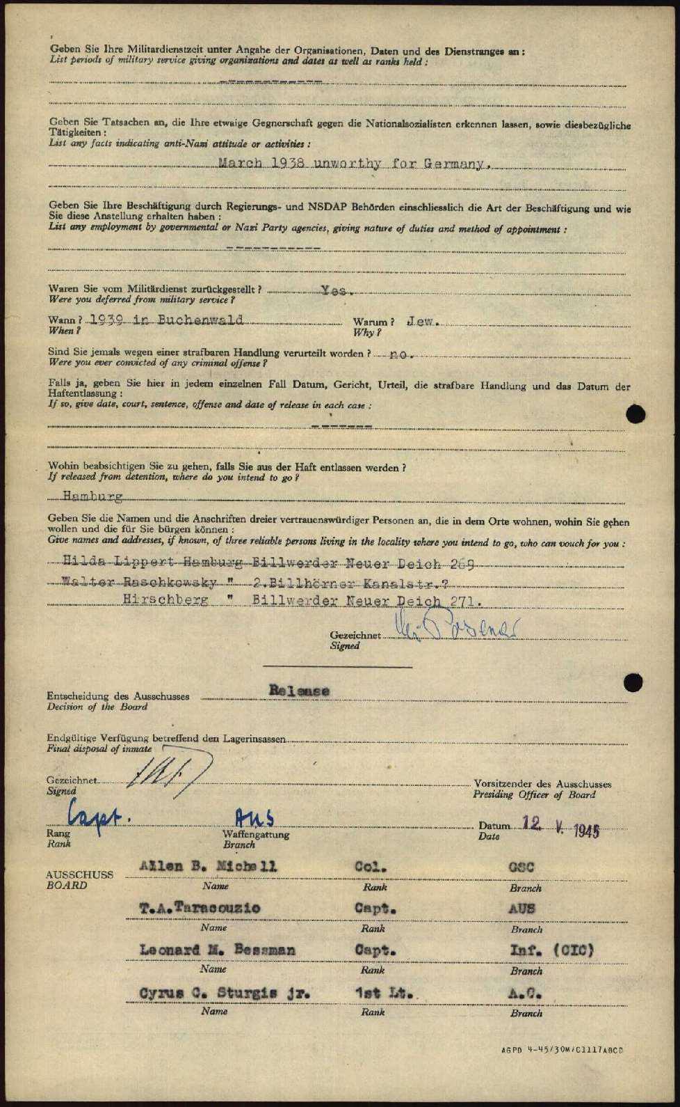 Inmates questionnaire of Curt Posener from the Buchenwald camp