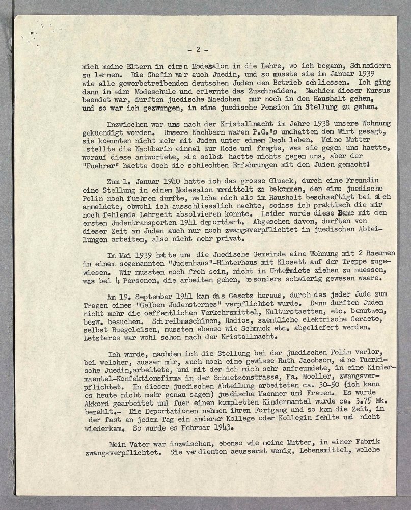 Until 1st January 1940 I had the great good fortune to have had a place arranged for me through a friend in a fashion house, which a Jewish Polish lady was allowed to continue to run; she registered me as employed to do housework, although I did do sewing after all, so that in my job I was able to complete the part of my apprenticeship that I had not yet finished. Unfortunately, this lady was deported on the first Jewish transport in 1941. In addition, from that time onwards, Jews were only allowed to work in Jewish units into which they had been conscripted, therefore no longer in private employment.