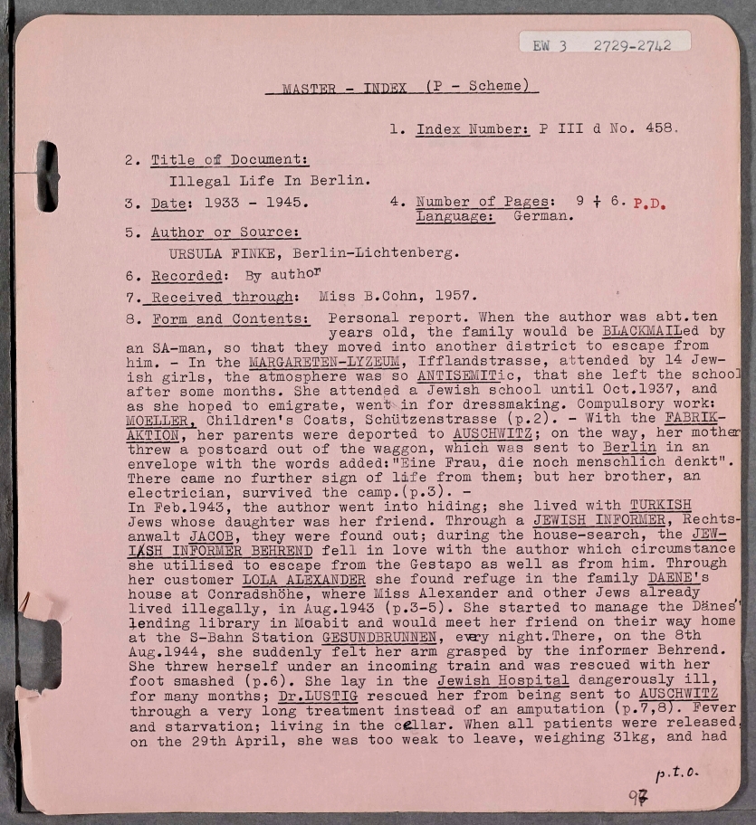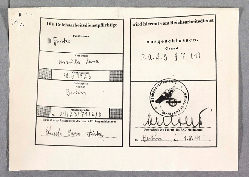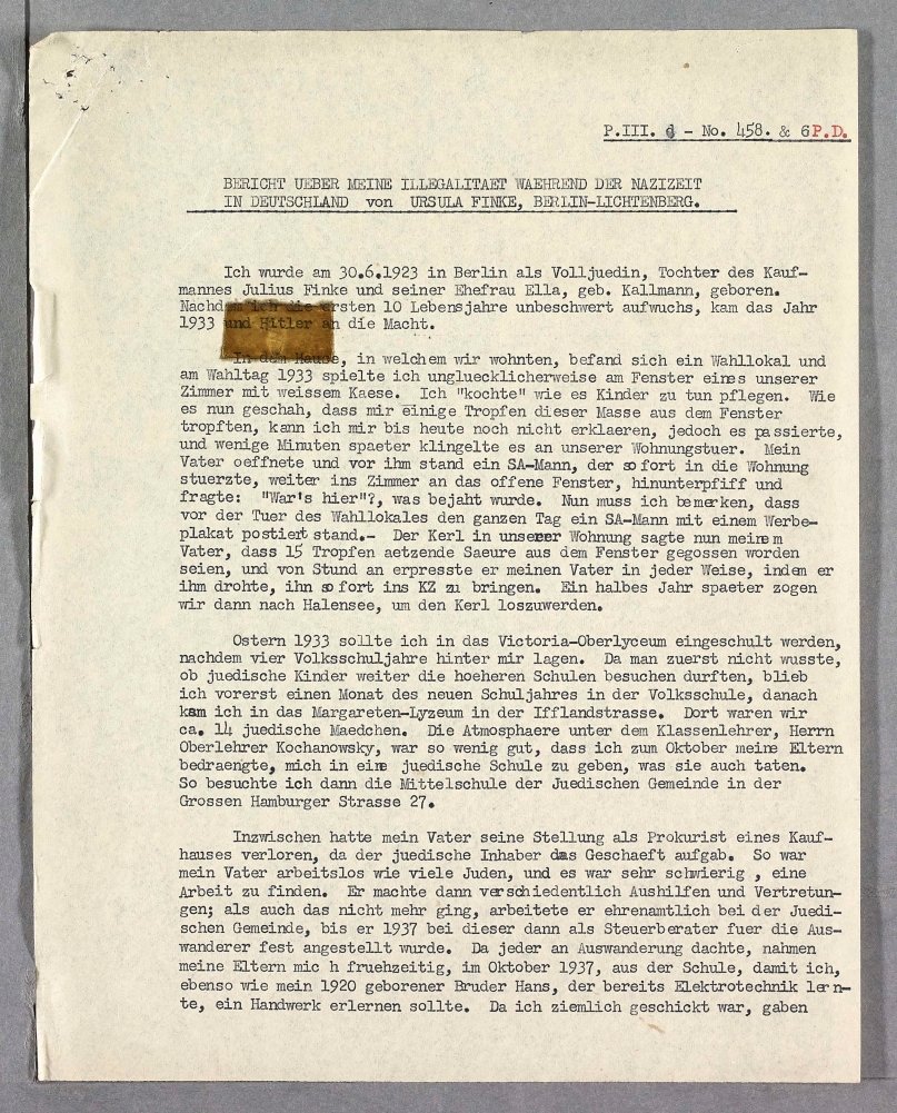 I was born on 30.6.1923 in Berlin as a full Jew, daughter of the businessman Julius Finke and his wife Ella, nee Kallmann. After spending the first ten years of my life growing up without a care in the world, the year 1933 arrived and Hitler came to power.