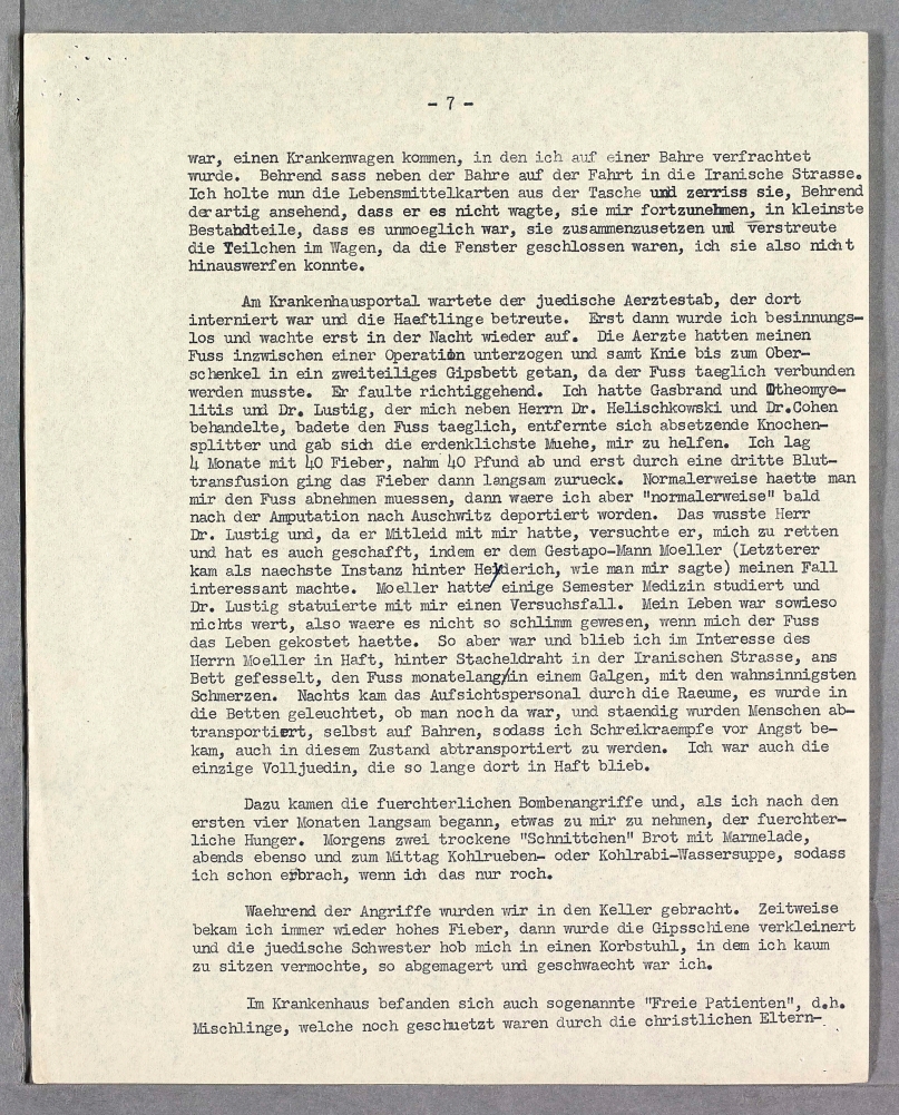 So wurde es April 1945. Die Angriffe kamen so haeufig, dass ich mit mehreren anderen Patienten in einem Krankenfahrstuhl wochenlang im dunklen Krankenhauskeller verbringen musste. In dem Rollstuhl konnte man sich nicht ruehren und musste alles darin erledigen, - - - ohne Hilfe der Schwester im Dunkeln. Als der Beschuss und die Kaempfe in Berlin begannen, bekam ich wieder Wundrose und 40 Fieber und man schaffte mir wenigstens ein Bett in den Keller, in dem ich dann bis zur Befreiung am 8. Mai 1945 lag. Ich war ein Skelett, wog 62 Pfund, also 31 Kilo. Waehrend des Beschusses wurde es einen Tag so schlimm, dass alle aus dem Teil des Kellers, in dem ich lag, fortliefen in andere Teile des Kellers, und ich blieb dort ganz allein zurueck, ans Bett gefesselt, konnte ich mich nicht ruehren. Zum Glueck passierte mir dort nichts, aber das Gefuehl der Hilflosigkeit ist unbeschreiblich. Da im Krankenhaus auch auslaendische Juden, u.a. russische Juden interniert waren, ging Herr Dr. Lustig mit einem gewissen Herrn Gordon zu dem dortigen russischen Kommandanten, und sie machten ihm plausibel, wer wir waren und baten um Schutz und Hilfe. Die Russen sagten, dass derjenige, der wuesste, wie die Deutschen in Russland gehaust haben, nicht glauben koennte, dass in Deutschland noch ein Jude am Leben sei. Herr Dr. Lustig machte ihnen das aber glaubhaft, und wir bekamen Schutz und Hilfe, sowie Nahrungsmittel. Erst am 30. Juni 1945 konnte ich das Krankenhaus verlassen, bin aber bis heute noch oft in aerztlicher Behandlung, da der Fuss nur sehr langsam ein Narbengewebe bekam, welches sich dann und wann oeffnet, und manchmal eitert ein Knochensplitter heraus. Auch nervlich habe ich leider stark gelitten. Mit viel Energie habe ich jedoch meine Meisterpruefung als Schneiderin bestanden und bin jetzt selbstaendig und ich arbeite, soweit es meine Kraefte erlauben. Durch kunstvolle orthopaedische Schuhe ist es mir moeglich, mit einiger Energie, trotz fehlender Ferse, nur auf dem Knochen gehend, mit geringer Bewegungsfaehigkeit des Fussgelenkes einigermassen anstaendig zu gehen.