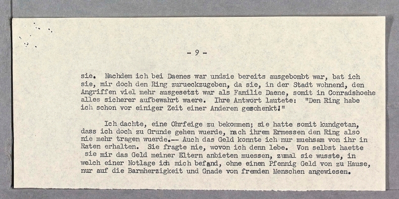 Ich dachte, eine Ohrfeige zu bekommen; sie hatte somit kundgetan, dass ich doch zu Grunde gehen wuerde, nach ihrem Ermessen den Ring also nie mehr tragen wuerde.-- Auch das Geld konnte ich nur muehsam von ihr in Raten erhalten. Sie fragte nie, wovon ich denn lebe. Von selbst haette sie mir das Geld meiner Eltern anbieten muessen, zumal sie wusste, in welch einer Notlage ich mich befand, ohne einen Pfennig Geld von zu Hause, nur auf die Barmherzigkeit und Gnade von fremden Menschen angewiesen.