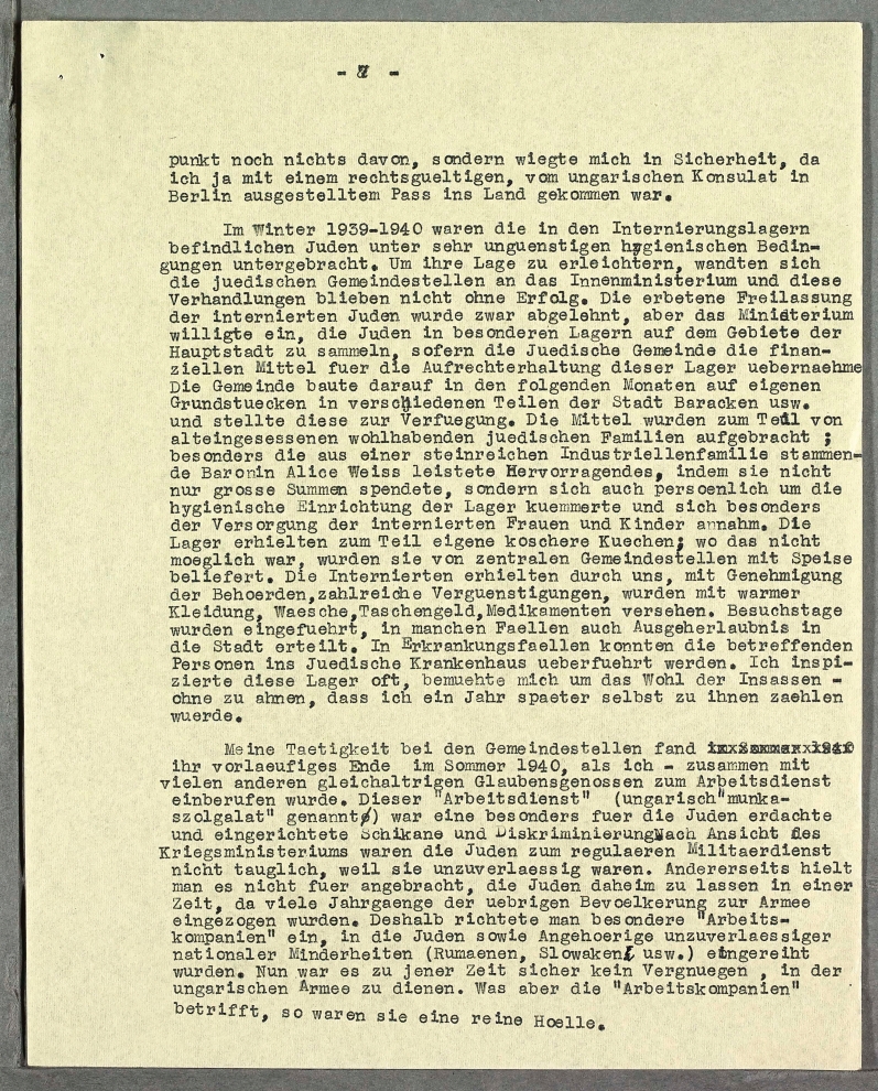 Im Winter 1939-1940 waren die in den Internierungslagern befindlichen Juden unter sehr unguenstigen hygienischen Bedingungen untergebracht. Um ihre Lage zu erleichtern, wandten sich die juedischen Gemeindestellen an das Innenministerium und diese Verhandlungen blieben nicht ohne Erfolg. Die erbetene Freilassung der internierten Juden wurde zwar abgelehnt, aber das Ministerium willigte ein, die Juden in besonderen Lagern auf dem Gebiete der Hauptstadt zu sammeln, sofern die Juedische Gemeinde die finanziellen Mittel fuer die Aufrechterhaltung dieser Lager uebernaehme. Die Gemeinde baute darauf in den folgenden Monaten auf eigenen Grundstuecken in verschiedenen Teilen der Stadt Baracken usw. und stellte diese zur Verfuegung. Die Mittel wurden zum Teil von alteingesessenen wohlhabenden juedischen Familien aufgebracht; besonders die aus einer steinreichen Industriellenfamilie stammende Baronin Alice Weiss leistete Hervorragendes, indem sie nicht nur grosse Summen spendete, sondern sich auch persoenlich um die hygienische Einrichtung der Lager kuemmerte und sich besonders der Versorgung der internierten Frauen und Kinder annahm. Die Lager erhielten zum Teil eigene koschere Kuechen; wo das nicht moeglich war, wurden sie von zentralen Gemeindestellen mit Speise beliefert. Die Internierten erhielten durch uns, mit Genehmigung der Behoerden, zahlreiche Vergunstigungen, wurden mit warmer Kleidung, Waesche, Taschengeld, Medikamenten versehen. Besuchstage wurden eingefuehrt, in manchen Faellen auch Ausgeherlaubnis in die Stadt erteilt. In Erkrankungsfaellen konnten die betreffenden Personen ins Juedische Krankenhaus ueberfuehrt werden. Ich inspizierte diese Lager oft, bemuehte mich um das Wohl der Insassen - ohne zu ahnen, dass ich ein Jahr spaeter selbst zu ihnen zaehlen wuerde.
