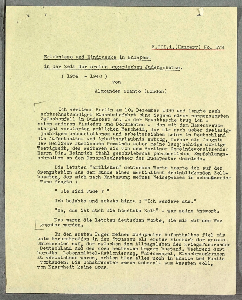I left Berlin on 10 December 1939 and arrived in Budapest after an uneventful 18-hour train journey. In my jacket pocket, together with other papers and documents, I had the official notification, stamped with a swastika, withdrawing my residence and work permits after over 30 years of hard work living in Germany without reproach. I also had a certificate from the Berlin Jewish congregation confirming my active role with them over a long period, plus a personal letter of recommendation to the general secretary of the Budapest congregation from our director Heinrich Stahl, the chairman of the Berlin congregation.
