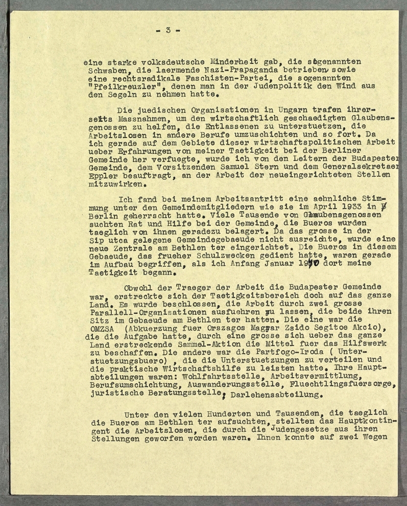 Die juedischen Organisationen in Ungarn trafen ihrerseits Massnahmen, um den wirtschaftlich geschaedigten Glaubensgenossen zu helfen, die Entlassenen zu unterstuetzen, die Arbeitslosen in andere Berufe umzuschichten und so fort. Da ich gerade auf dem Gebiete dieser wirtschaftapolitischen Arbeit ueber Erfahrungen von meiner Taetigkeit bei der Berliner Gemeinde her verfuegte, wurde ich von den Leitern der Budapestei Gemeinde, dem Vorsitzenden Samuel Stern und dem Generalsekretaer Eppler beauftragt, an der Arbeit der neueingerichteten Stellen mitzuwirken.