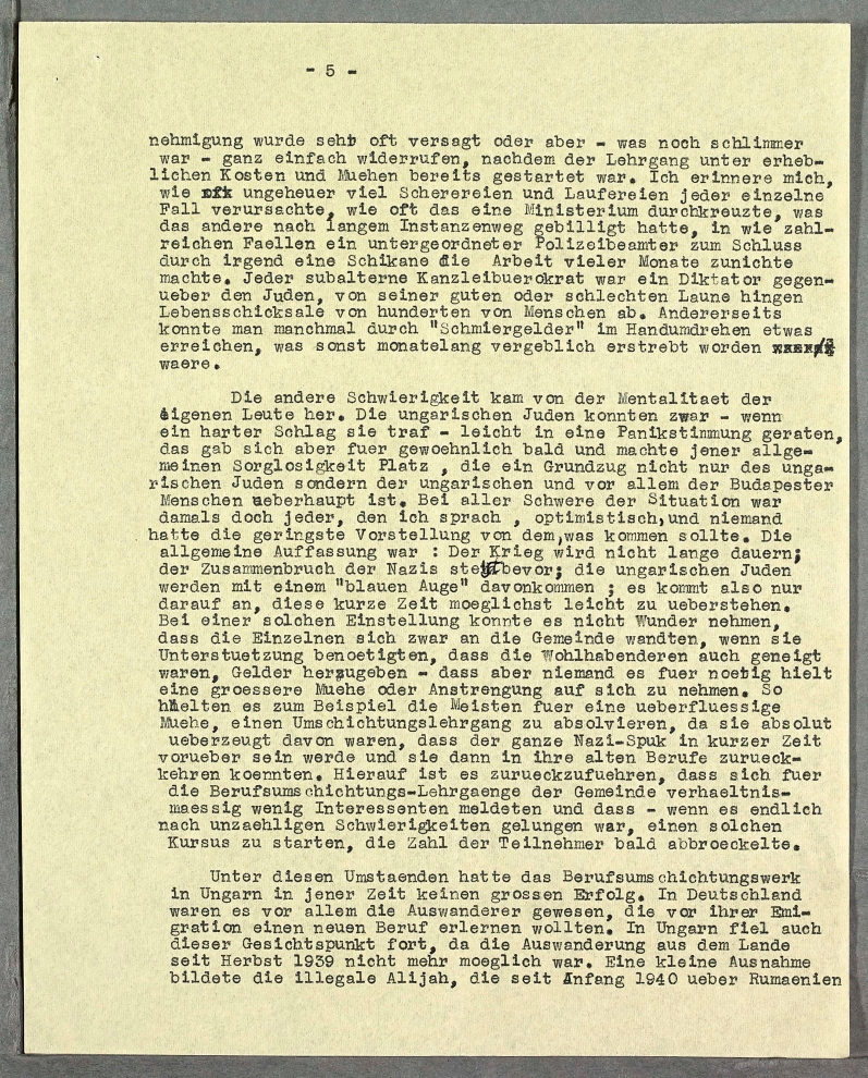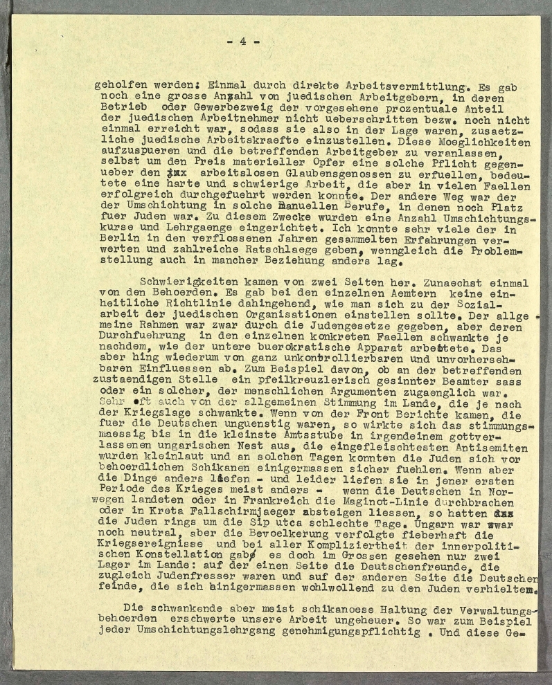 Ich fand bei meinem Arbeitsantritt eine aehnliche Stimmung unter den Gemeindemitgliedern wie sie im April 1933 in Berlin geherrscht hatte. Viele Tausende von Glaubensgenossen suchten Rat und Hilfe bei der Gemeinde, die Bueros wurden taeglich von ihnen geradezu belagert. Da das grosse in der Sip utca gelegene Gemeindegebaeude nicht ausreichte, wurde eine neue Zentrale am Bethlen ter eingerichtet. Die Bueros in diesem Gebaeude, das frueher Schulzwecken gedient hatte, waren gerade im Aufbau begriffen, als ich Anfang Januar 1940 dort meine Taetigkeit begann.