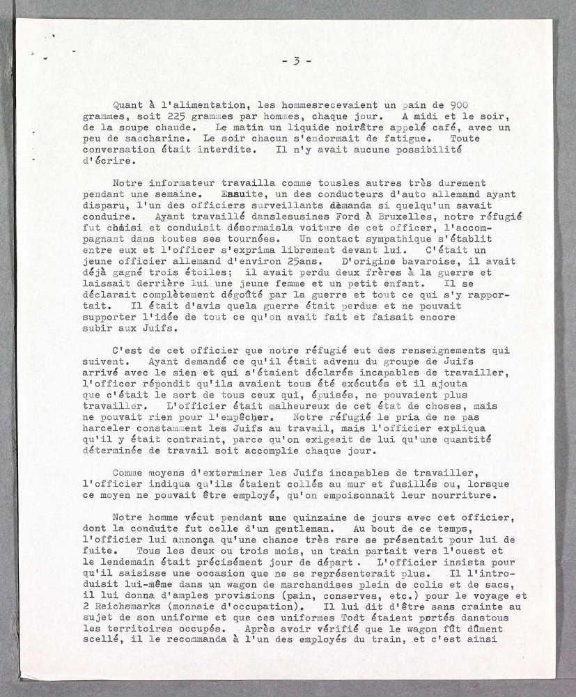 Notre informateur travailla comme tousles autres très durement pendant une semaine. Ensuite, un des conducteurs d’auto allemand ayant disparu, l’un des officiers surveillants demanda si quelqu’un savait conduire. Ayant travaillé danslesusines Ford à Bruxelles, notre réfugié fut choisi et conduisit désormaisla voiture de cet officer, l’accompagnant dans toutes ses tournées. Un contact sympathique s’établit entre eux et l’officer s’exprima librement devant lui. C’était un jeune officier allemand d’environ 25ans. D'origine bavaroise, il avait déjà gagné trois étoiles; il avait perdu deux frères à la guerre et laissait derrière lui une jeune femme et un petit enfant. Il se déclarait complètement dégoûté par la guerre et tout ce qui s’y rapportait. Il était d’avis quela guerre était perdue et ne pouvait supporter l’idée de tout ce qu’on avait fait et faisait encore subir aux Juifs.