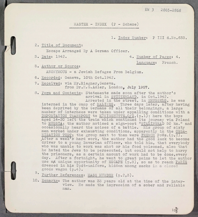 Anonymous, arrest in Brussels, internment in Malines and escape; testimony recorded by Gerhard Riegner
