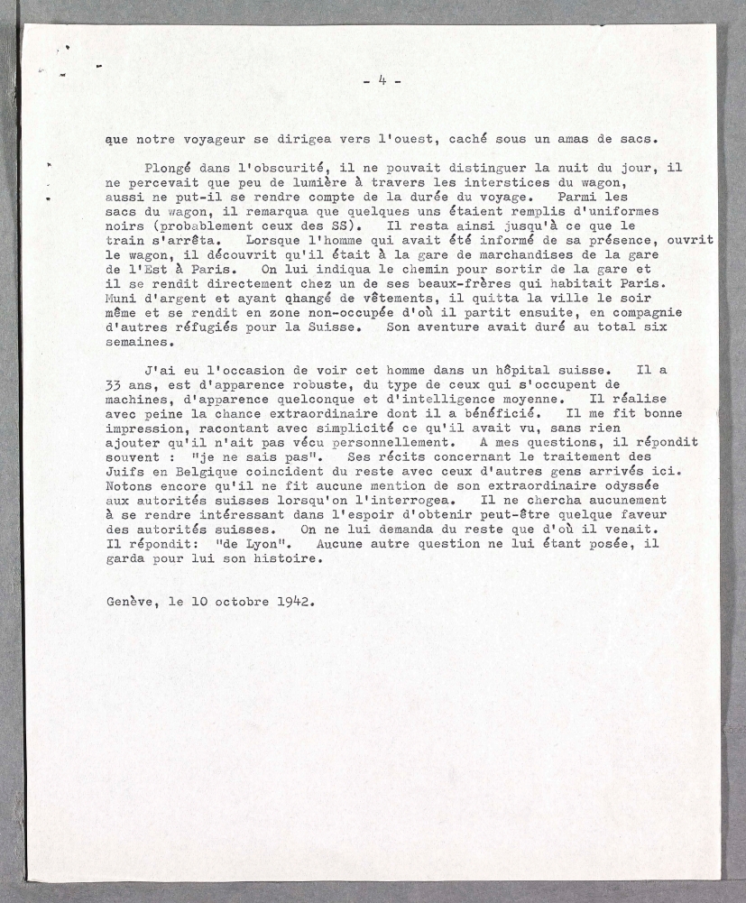 Plongé dans l’obscurité, il ne pouvait distinguer la nuit du jour, il ne percevait que peu de lumière à travers les interstices du wagon, aussi ne put-il se rendre compte de la durée du voyage. Parmi les sacs du wagon, il remarqua que quelques uns étaient remplis d’uniformes noirs (probablement ceux des SS). Il resta ainsi jusqu’à ce que le train s’arrêta. Lorsque l’homme qui avait été informé de sa présence, ouvrit le wagon, il découvrit qu’il était à la gare de marchandises de la gare de l’Est à Paris. On lui indiqua le chemin pour sortir de la gare et il se rendit directement chez un de ses beaux-frères qui habitait Paris. Muni d’argent et ayant changé de vêtements, il quitta la ville le soir même et se rendit en zone non-occupée d’où il partit ensuite, en compagnie d’autres réfugiés pour la Suisse. Son aventure avait duré au total six semaines.