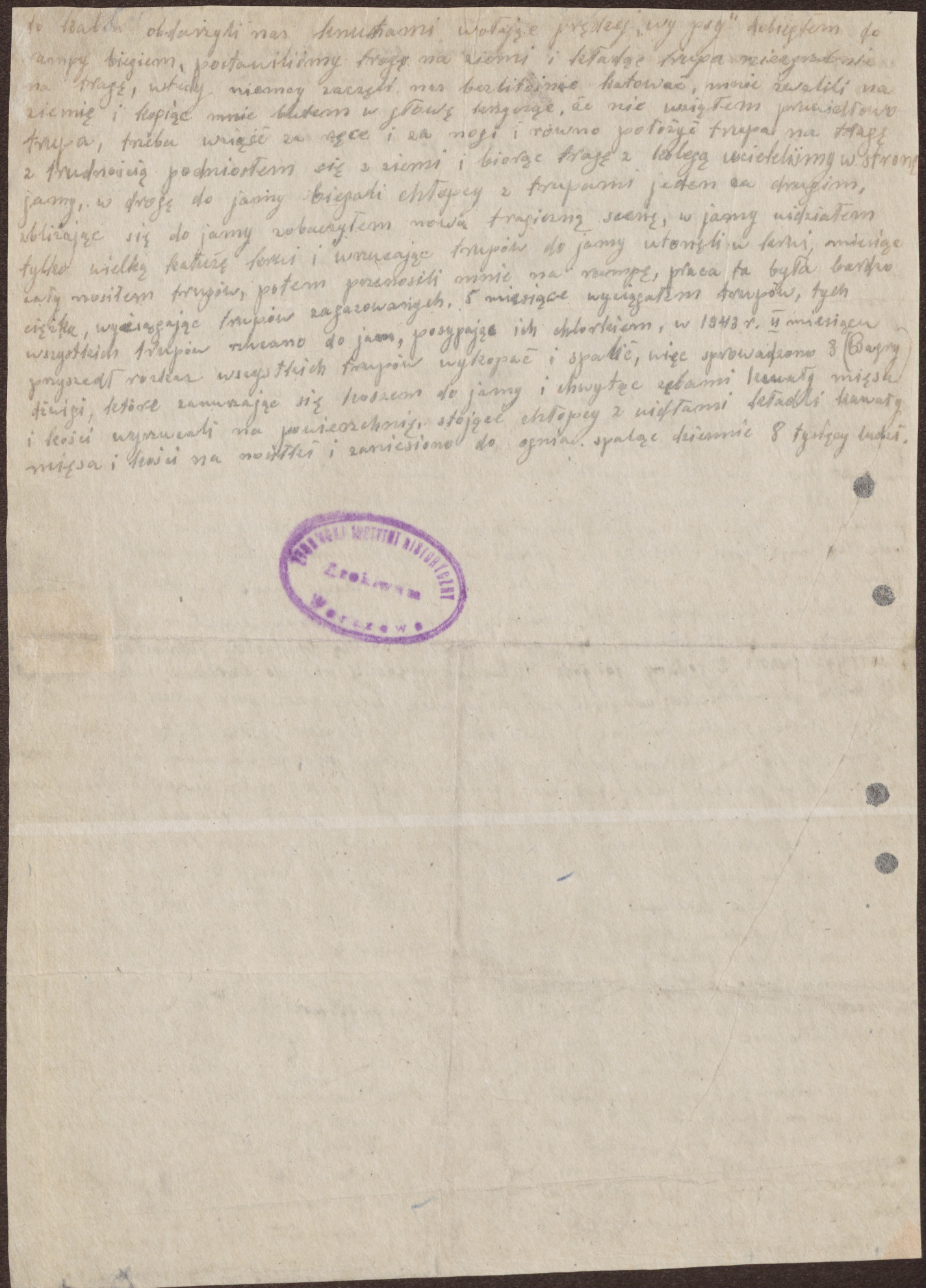 obdarzyli nas knutami wołając prędzej wy psy. Dobiegłem do rampy biegiem, postawiliśmy tragę na ziemi i kładąc trupa niezgrabnie na tragę, wtedy Niemcy zaczęli nas bezlitośnie katować, mnie zwalili na ziemię i kopiąc mnie butem w głowę, krzycząc, że nie wziąłem prawidłowo trupa na tragę. Z trudnością podniosłem się z ziemi i biorąc trupa z kolegą uciekliśmy w stronę jamy. W drogę do jamy biegali chłopcy z trupami, jeden za drugim. Zbliżając się do jamy, zobaczyłem nową tragiczną scenę, w jamach widziałem tylko wielką kałużę krwi i wrzucając trupów do jamy utonęli w krwi. Miesiąc cały nosiłem trupów, potem przenosili mnie na rampę, praca była bardzo ciężka, wyciągając trupów zagazowanych. 5 miesiące wyciągałem trupów. Tych wszystkich trupów rzucano do jam, posypując ich chlorkiem, w 1943 roku, w II miesiącu przyszedł rozkaz wszystkich trupów wykopać i spalić, więc sprowadzono 3 dźwigi, które zanurzając się koszem do jamy i chwytąc zębami kawały mięsa i kości, wyrzucali na powierzchnię, stojące chłopcy z widłami kładli kawały mięsa i kości na nosiłki i zaniesiono do ognia, spaląc dziennie 8 tysięcy ludzi.