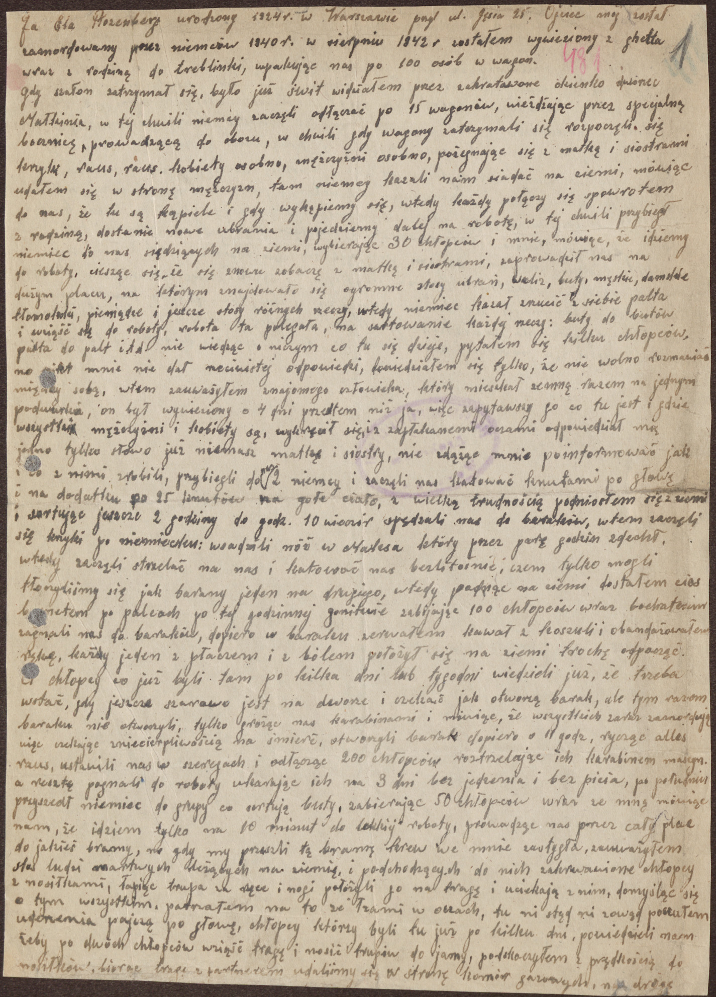 you don’t have any mother or sister any more. Before he managed to tell me what happened to them and how, 2 Germans ran up to us and started to thrash us in the head with whips, then an additional 25 blows on our bare bodies. I got up from the ground with great difficulty, after we sorted things for another 2 hours until 10 o'clock in the evening, they herded us to the barracks, suddenly they started shouting in German: they stabbed Maks with a knife, who then was dying for a couple of hours, then they started to shoot at us and torture us mercilessly, with whatever they could. We pushed against each other like sheep, and when I fell to the ground, I was hiton the fingers with a bayonet. After an hour of being chased like that, they killed 100 boys, including the hero [who had stabbed Max], and chased us to the barracks, and it was only in the barracks that I managed to rip a piece of my shirt off to bandage my hand, each one of us laid down on the ground, crying and in pain, to rest a little. The boys who had already been there for a few days or weeks already knew that we had to get up when the light was still grayish outside and wait until they open the barracks, but this time they didn’t open the barracks, they only threatened us with machine guns and said that they would all kill us in a minute, so waiting impatiently for death. They opened the barracks only at 11 o'clock in the morning, shouting