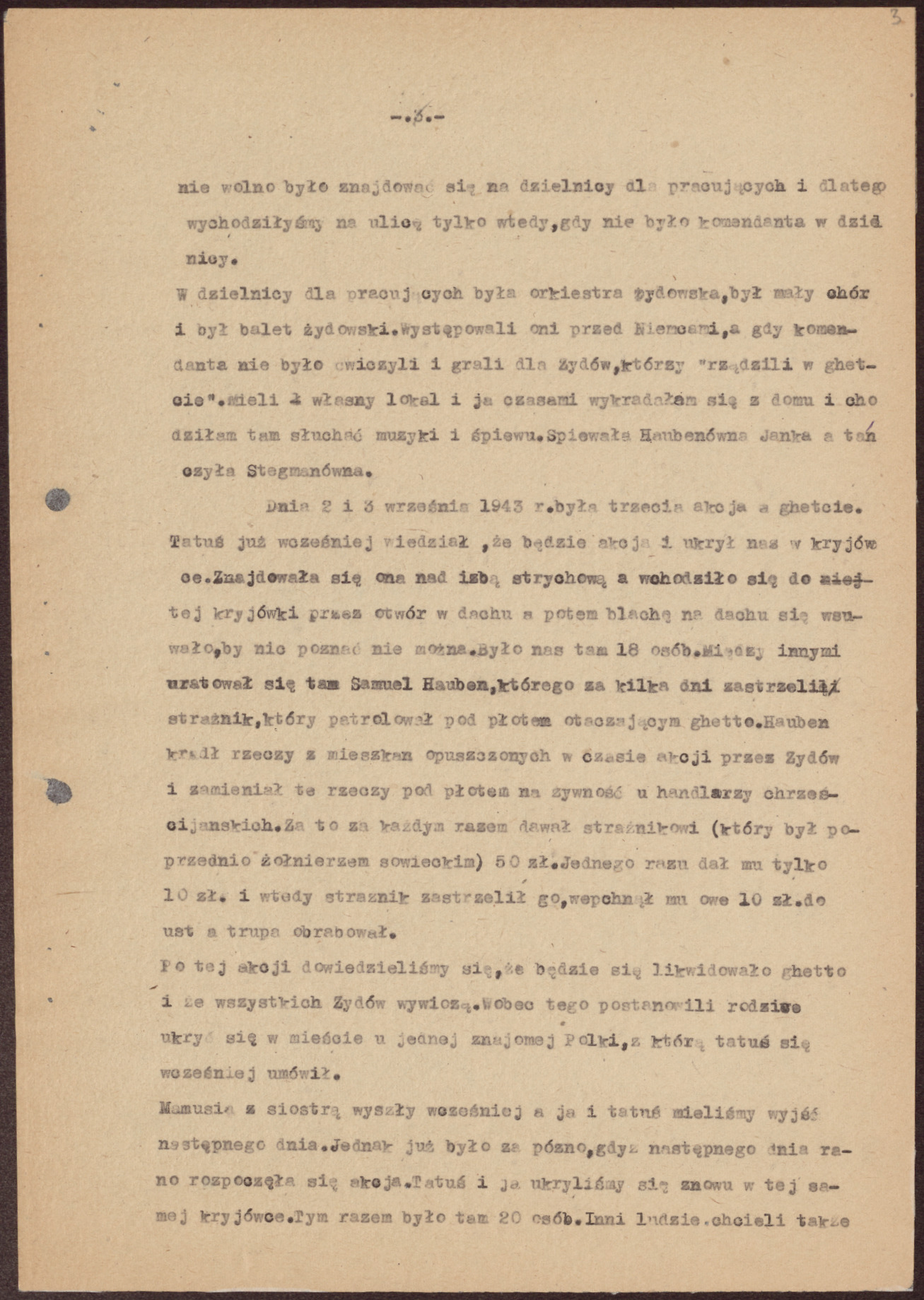 Dnia 2 i 3 września 1943 roku była trzecia akcja w getcie. Tatuś już wcześniej wiedział, że będzie akcja i ukrył nas w kryjówce. Znajdowała się ona nad izbą strychową, a wchodziło się do tej kryjówki przez otwór w dachu, a potem blachę na dachu się wsuwało, by nic poznać nie można. Było nas tam 18 osób. Między innymi uratował się tam Samuel Hauben, którego za kilka dni zastrzelił strażnik, który patrolował pod płotem otaczającym getto. Hauben kradł rzeczy z mieszkań opuszczonych w czasie akcji przez Żydów i zamieniał te rzeczy pod płotem na żywność u handlarzy chrześcijańskich. Za to za każdym razem dawał strażnikowi (który był poprzednio żołnierzem sowieckim) 50 złotych. Jednego razu dał mu tylko 10 złotych i wtedy strażnik zastrzelił go, wepchnął mu owe 10 złotych do ust, a trupa obrabował.