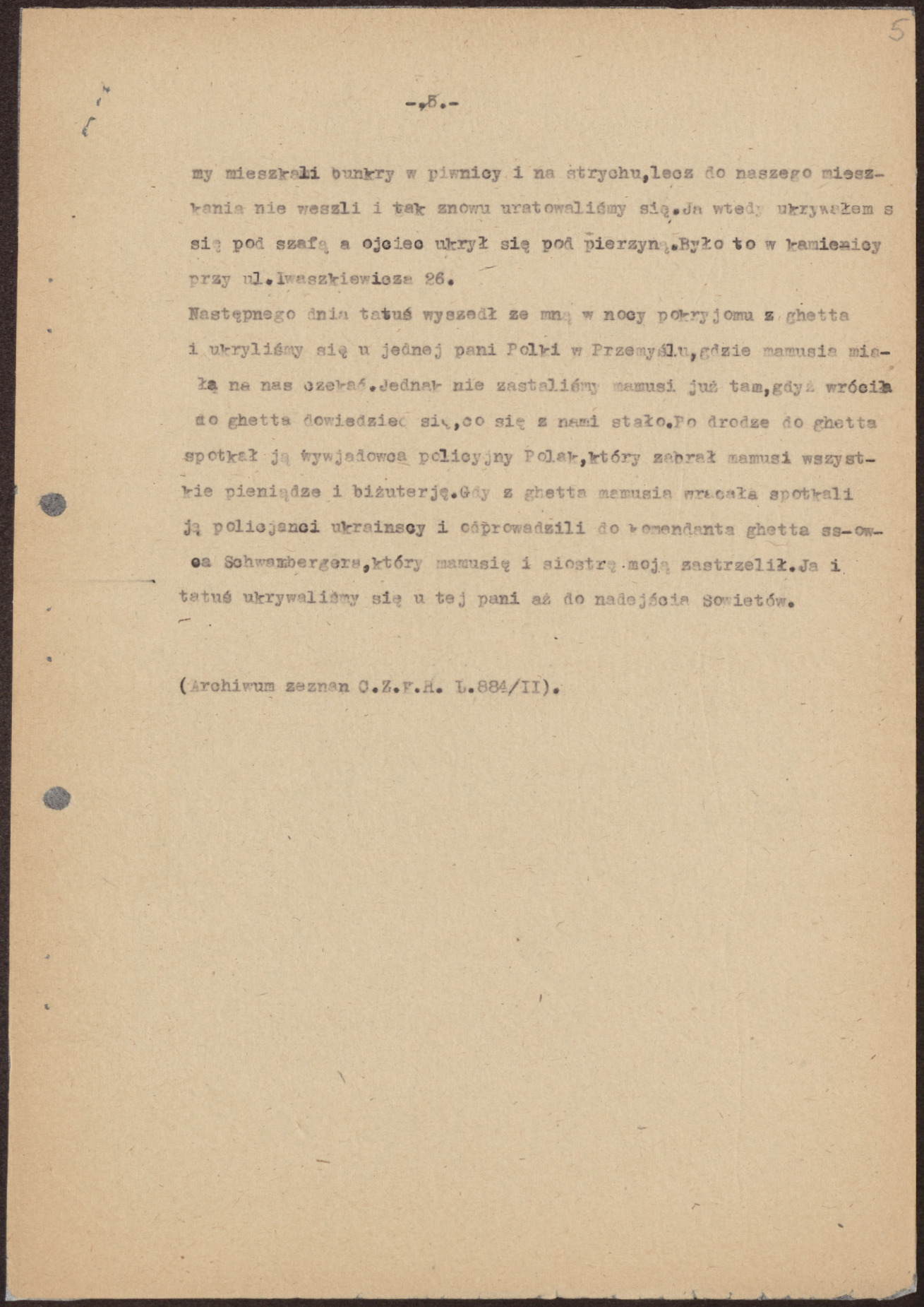Następnego dnia tatuś wyszedł ze mną w nocy po kryjomu z getta i ukryliśmy się u jednej pani Polki w Przemyślu, gdzie mamusia miała na nas czekać. Jednak nie zastaliśmy mamusi już tam, gdyż wróciła do getta dowiedzieć się, co się z nami stało. Po drodze do getta spotkał ją wywiadowca policyjny Polak, który zabrał mamusi wszystkie pieniądze i biżuterię. Gdy z getta mamusia wracała, spotkali ją policjanci ukraińscy i odprowadzili do komendanta getta, SS-owca Schwambergera, który mamusię i siostrę moją zastrzelił. Ja i tatuś ukrywaliśmy się u tej pani aż do nadejścia Sowietów.