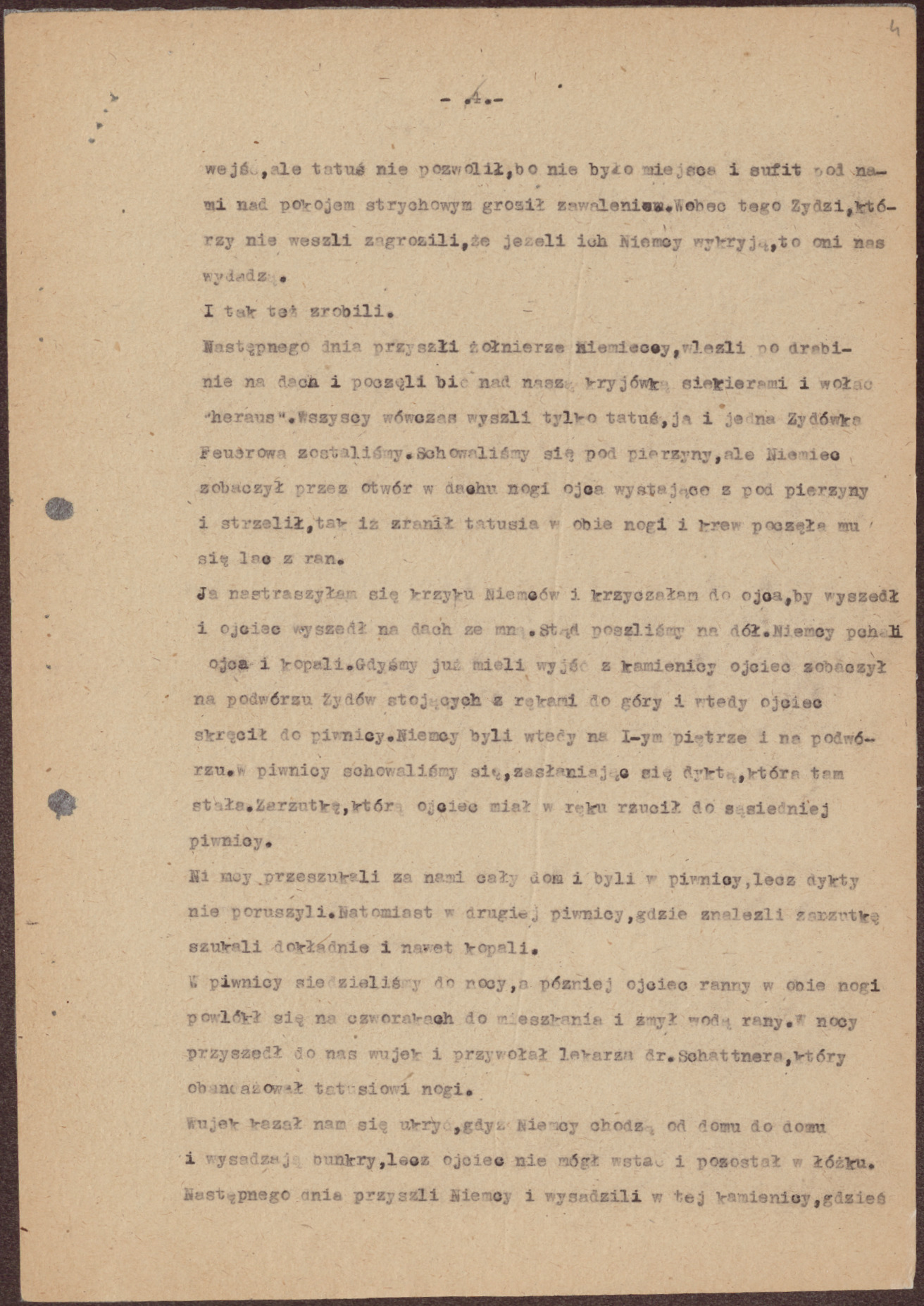 Wszyscy wówczas wyszli, tylko tatuś, ja i jedna Żydówka Feuerowa zostaliśmy. Schowaliśmy się pod pierzyny, ale Niemiec zobaczył przez otwór w dachu nogi ojca