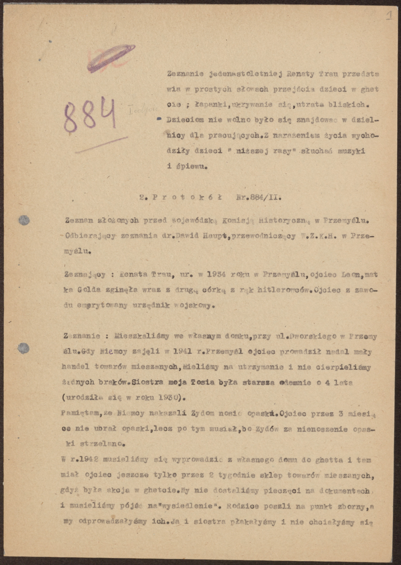 Witness: Renata Trau, born 1934 in Przemyśl, father Leon, mother Golda was killed together with her second daughter at the hands of the hitlerites. Father is by profession a military officer on pension.