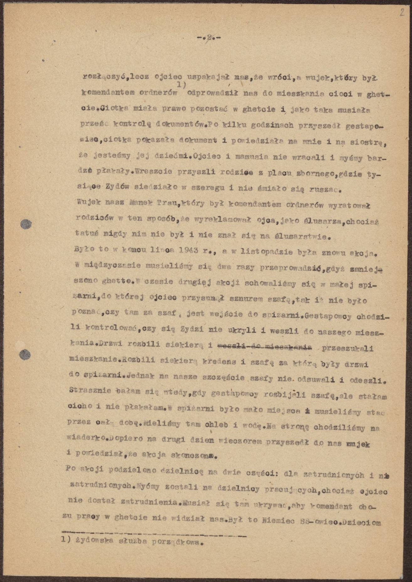Było to w końcu lipca 1943 roku, a w listopadzie była znowu akcja. W międzyczasie musieliśmy się dwa razy przeprowadzić, gdyż zmniejszono getto. W czasie drugiej akcji schowaliśmy się w małej spiżarni, do której ojciec przysunął sznurem szafę tak, iż nie było poznać, czy tam za szafą jest wejście do spiżarni. Gestapowcy chodzili kontrolować, czy się Żydzi nie ukryli i weszli do naszego mieszkania. Drzwi rozbili siekierą i przeszukali mieszkanie. Rozbili siekierą kredens i szafę, za którą były drzwi do spiżarni. Jednak na nasze szczęście szafy nie odsuwali i odeszli. Strasznie bałam się wtedy, gdy gestapowcy rozbijali szafę, ale stałam cicho i nie płakałam. W spiżarni było mało miejsca i musieliśmy stać przez całą dobę. Mieliśmy tam chleb i wodę. Na stronę chodziliśmy na wiaderko. Dopiero na drugi dzień wieczorem przyszedł do nas wujek i powiedział, że akcja skończona.